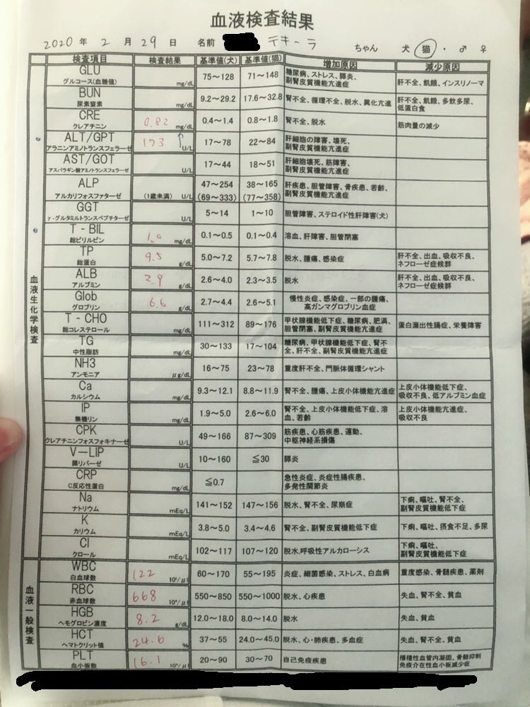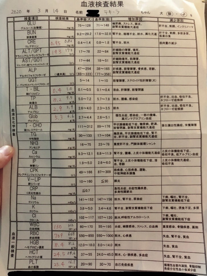 2/29から3/14までのテキの血液検査結果をまとめました!(画像見づらくてすみません。)