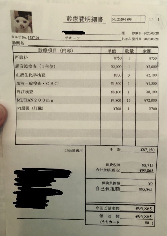 その他、再診料、超音波検査費、血液生化学検査費、血液一般検査・CBC費、外注検査費、内服薬(肝臓)、合わせて合計95,865円(税込)になります。
