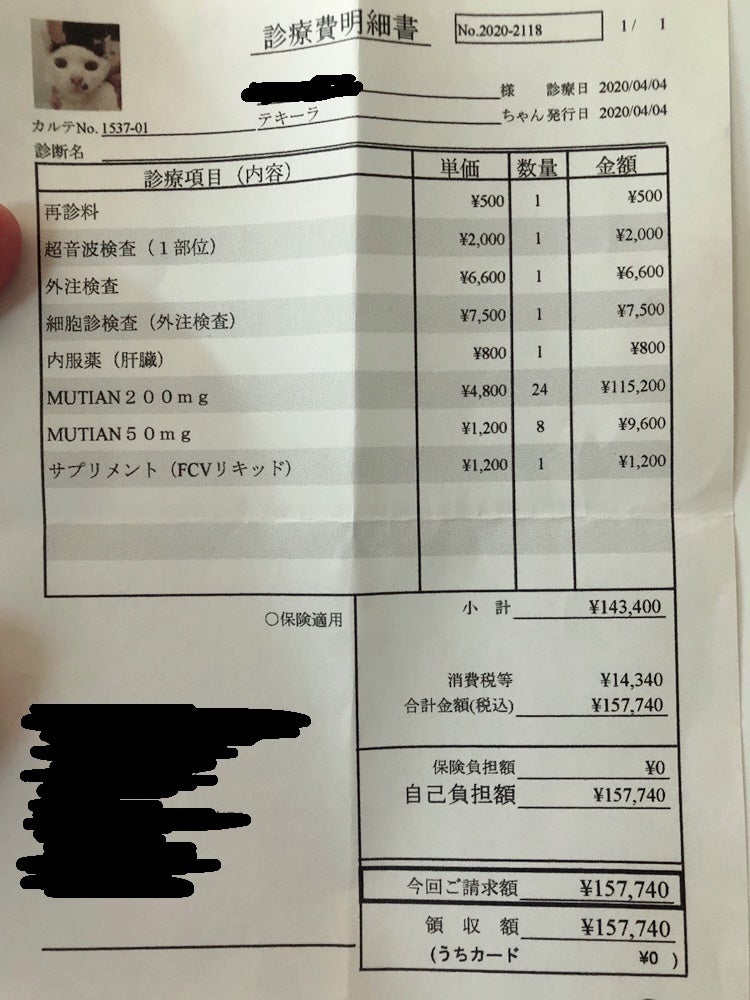 その他、再診料、超音波検査費、外注検査費、細胞診検査費、内服薬(肝臓)、サプリメント合わせて合計157,740円(税込)になります。