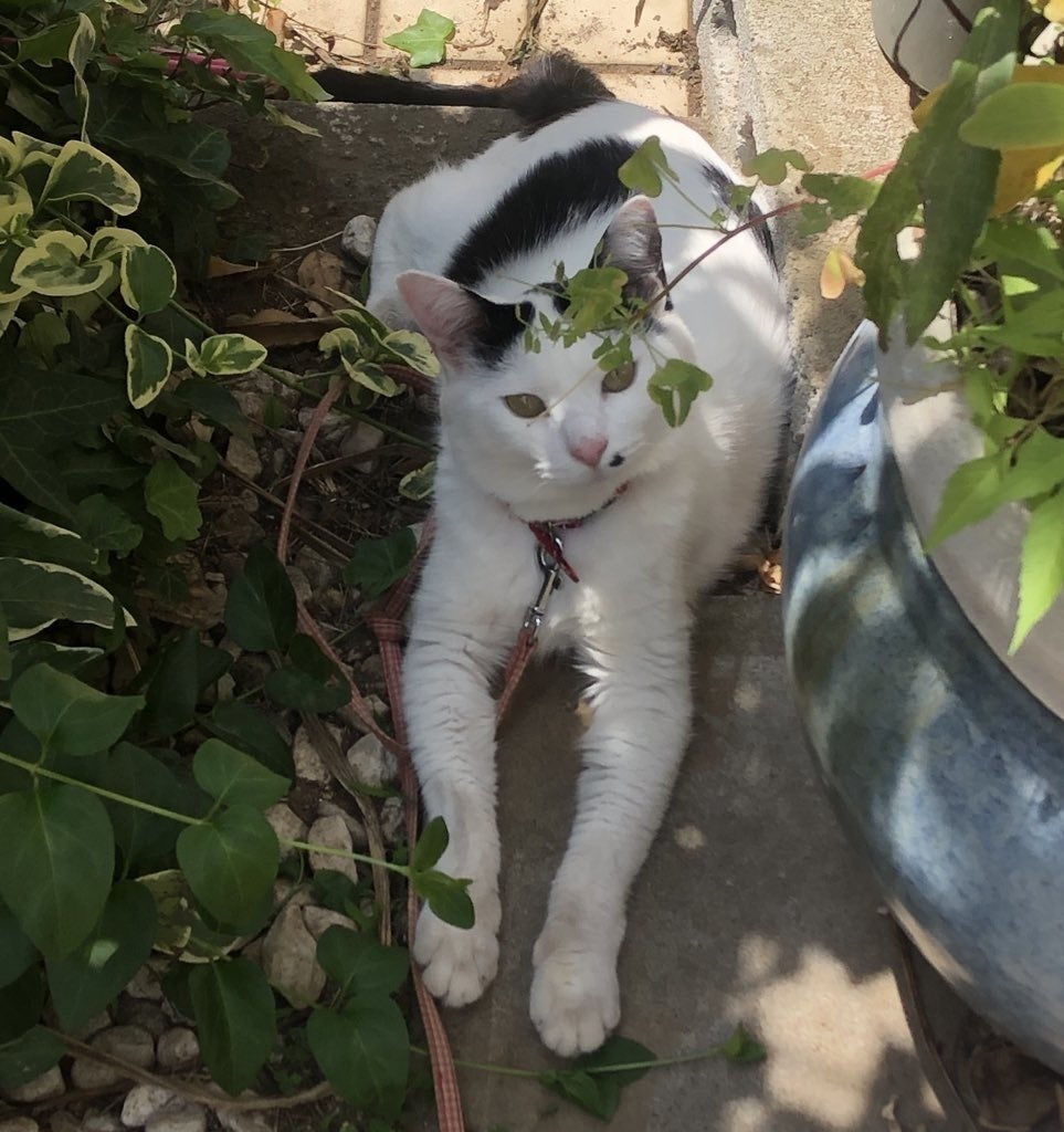 ↑庭で日光浴するテキ(リードしています)