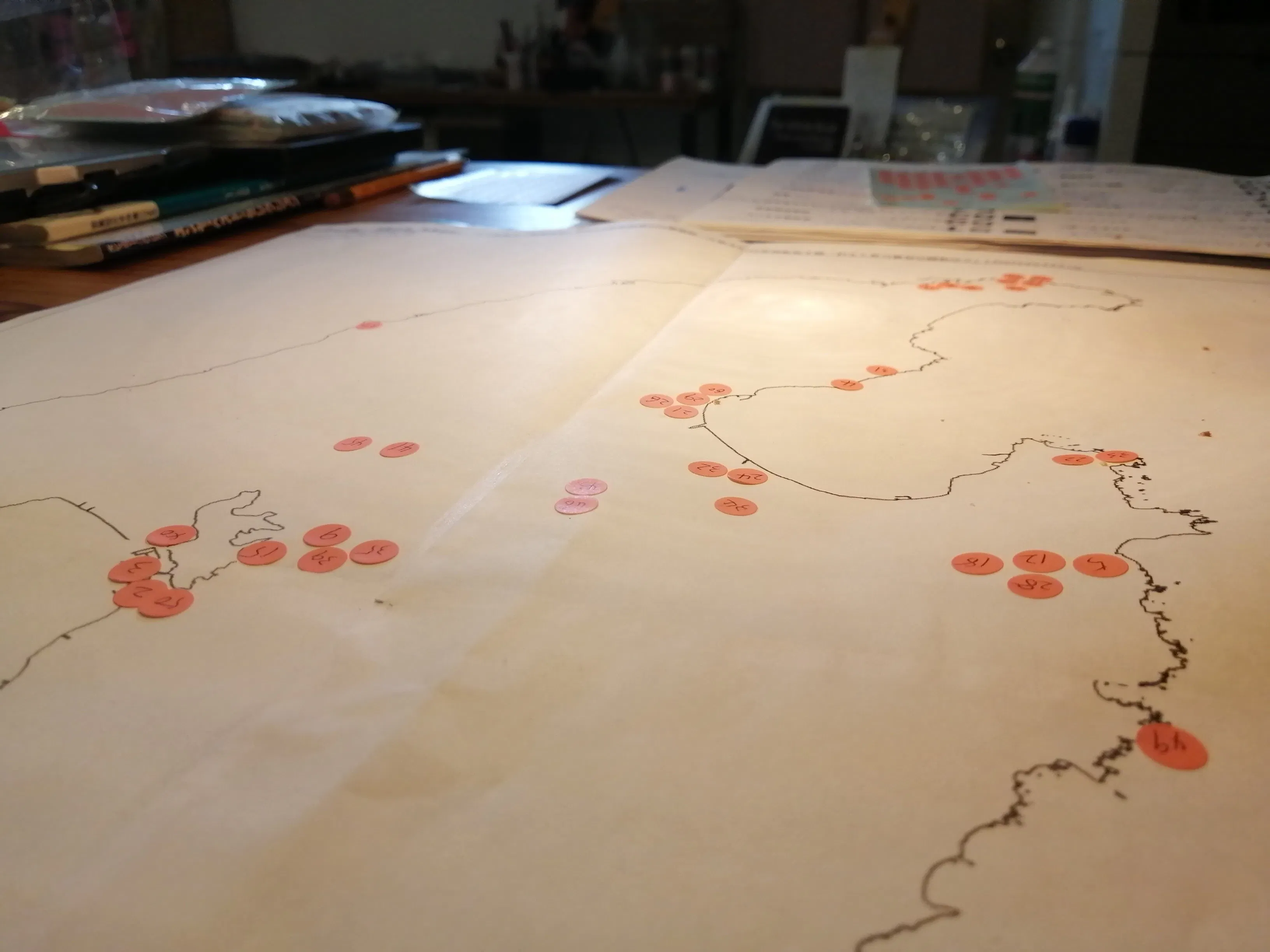 やりたいことはどんな分布になるのか?白地図に1〜50を貼ってみました。(写真)