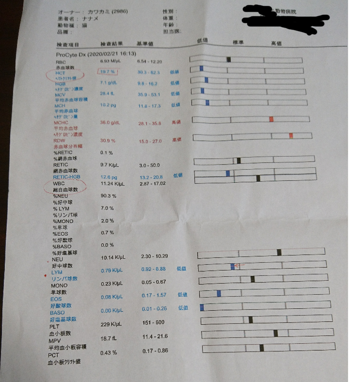 2020/08/22 22:28ナナメくんのFIP治療にご支援、応援をくださった皆様暑い暑い毎日ですが、お元気ですか?猫たちも暑さで伸びてますマスク生活で、本当にこの夏は辛いです早く暑さが落ち着くといいですねおかげさまでナナメくんは、毎日元気で食欲もあり、どんどん大きくコロコロと成長しています体重は4.8kgにまでなり、家の子のなかで一番の大物です!84日間のMUTIAN投薬が終わってから、90日間の経過観察が、8/13で終了予定でしたので、当日に血液検査をしてきました残念ながら、血液検査の結果、経過観察終了は先延ばしになりました《8/13血液検査の結果》 FIPの指標である「A/G比」は0.7→目標の0.8は中々到達せず、細かく計算するとむしろ下がっており、残念ですまた、腎臓病の早期診断SDMAも行いましたが異常なしでしたただし、「クレアチニン」の数値が異常値→筋肉質なタイプだと高くなる傾向がある、SDMAでも異常は見られないので、心配ないそして、今回は心配な結果が出てしまいました↓白血球の数値、なかでも好中球の数値が高値でした(↓拡大)風邪や何かしらの炎症、FIPでも高値になるとのことですこの結果を協力病院へお伝えしたところ、1週間抗生剤を投与し、再度血液検査をしてみるように指示がありましたアモキクリアという抗生剤を10日分処方していただきました約1週間の投薬後、本日8/22に再度血液検査をしてきました《8/22血液検査の結果》「A/G比」→ギリギリ0.7更に下がってしまいましたしかし、心配していた白血球の数値は正常値に戻っていました!お薬の効果で正常になっただけである可能性もあるので、抗生剤をあと3日間飲ませ、2週間後に再検査します《今回の診療費の明細》8/13分抗生剤8/22分《最後に》最近のナナメくんは、いつもいたリビングに預かり子猫がいるので、寄り付かなくなりました廊下や階段、薄暗いところでまったりしていますつぶ兄とは相変わらず仲良しでくっついています今回は、90日間の経過観察が終了し、寛解しました!とお伝え出来ると思っていたので、残念でなりません2週間後に再度血液検査をし、よいご報告ができる事を願っています皆さま、どうぞ暑さのなか、ご無理なさらず、コロナにも用心されてお元気でお過ごしくださいね《治療費》合計 ¥917,562[MUTIAN]合計 ¥850,0004/26¥225,000(450㎎×20日)4/19¥112,500(450㎎×10日)3/22¥262,500(350㎎×30日)2/28 ¥150,000(300㎎×20日)2/22 ¥100,000(400㎎×10日)[診療費] 合計¥67,5628/22 ¥6,050(血液検査)8/16 ¥550(抗生剤処方)8/13 ¥6,050(血液検査、SDMAはキャンペーンで無料)7/14 ¥7,700(血液検査、含むSDMA(腎臓病早期診断)6/14 ¥9,900(血液検査、含むSDMA(腎臓病早期診断)、外注検査(SAA))5/15 ¥5,940(血液検査、含むSDMA(腎臓病早期診断))4/19 無料(検診、エコー)3/17 ¥8,580(血液検査、エコー、外注検査)2/28 ¥4,290(血液検査、エコー)2/22 ¥3,630(点滴)2/21 ¥11,440(点滴(インターフェロン、ステロイド))2/20 ¥3,432(便検査、点滴(解熱剤ビタミンなど))《MUTIAN投薬量》2/22~3/2(10日)→400㎎ 3/3~3/22(20日)→300㎎ 3/23~4/1(10日)→350㎎4/2~4/18(17日)→400㎎4/19~5/15(27日)→450㎎合計84日 もっと見る[活動報告⑪]