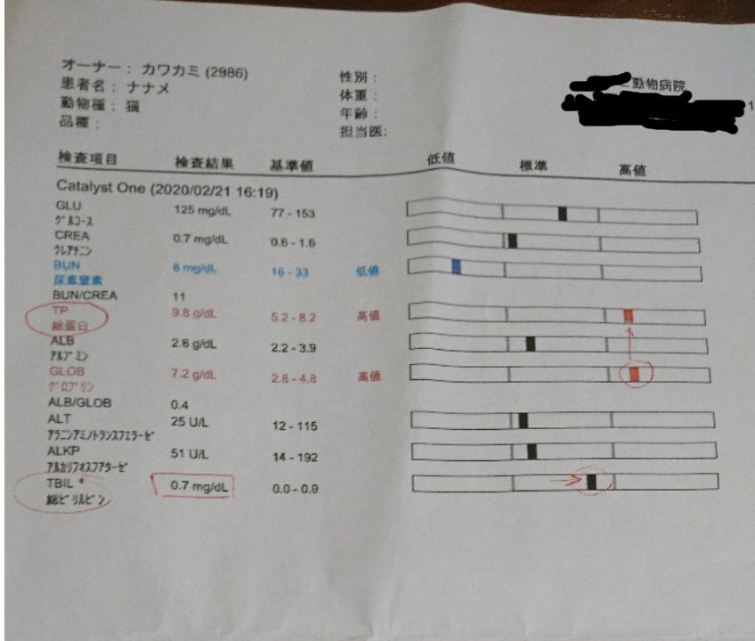 2020/08/22 22:28ナナメくんのFIP治療にご支援、応援をくださった皆様暑い暑い毎日ですが、お元気ですか?猫たちも暑さで伸びてますマスク生活で、本当にこの夏は辛いです早く暑さが落ち着くといいですねおかげさまでナナメくんは、毎日元気で食欲もあり、どんどん大きくコロコロと成長しています体重は4.8kgにまでなり、家の子のなかで一番の大物です!84日間のMUTIAN投薬が終わってから、90日間の経過観察が、8/13で終了予定でしたので、当日に血液検査をしてきました残念ながら、血液検査の結果、経過観察終了は先延ばしになりました《8/13血液検査の結果》 FIPの指標である「A/G比」は0.7→目標の0.8は中々到達せず、細かく計算するとむしろ下がっており、残念ですまた、腎臓病の早期診断SDMAも行いましたが異常なしでしたただし、「クレアチニン」の数値が異常値→筋肉質なタイプだと高くなる傾向がある、SDMAでも異常は見られないので、心配ないそして、今回は心配な結果が出てしまいました↓白血球の数値、なかでも好中球の数値が高値でした(↓拡大)風邪や何かしらの炎症、FIPでも高値になるとのことですこの結果を協力病院へお伝えしたところ、1週間抗生剤を投与し、再度血液検査をしてみるように指示がありましたアモキクリアという抗生剤を10日分処方していただきました約1週間の投薬後、本日8/22に再度血液検査をしてきました《8/22血液検査の結果》「A/G比」→ギリギリ0.7更に下がってしまいましたしかし、心配していた白血球の数値は正常値に戻っていました!お薬の効果で正常になっただけである可能性もあるので、抗生剤をあと3日間飲ませ、2週間後に再検査します《今回の診療費の明細》8/13分抗生剤8/22分《最後に》最近のナナメくんは、いつもいたリビングに預かり子猫がいるので、寄り付かなくなりました廊下や階段、薄暗いところでまったりしていますつぶ兄とは相変わらず仲良しでくっついています今回は、90日間の経過観察が終了し、寛解しました!とお伝え出来ると思っていたので、残念でなりません2週間後に再度血液検査をし、よいご報告ができる事を願っています皆さま、どうぞ暑さのなか、ご無理なさらず、コロナにも用心されてお元気でお過ごしくださいね《治療費》合計 ¥917,562[MUTIAN]合計 ¥850,0004/26¥225,000(450㎎×20日)4/19¥112,500(450㎎×10日)3/22¥262,500(350㎎×30日)2/28 ¥150,000(300㎎×20日)2/22 ¥100,000(400㎎×10日)[診療費] 合計¥67,5628/22 ¥6,050(血液検査)8/16 ¥550(抗生剤処方)8/13 ¥6,050(血液検査、SDMAはキャンペーンで無料)7/14 ¥7,700(血液検査、含むSDMA(腎臓病早期診断)6/14 ¥9,900(血液検査、含むSDMA(腎臓病早期診断)、外注検査(SAA))5/15 ¥5,940(血液検査、含むSDMA(腎臓病早期診断))4/19 無料(検診、エコー)3/17 ¥8,580(血液検査、エコー、外注検査)2/28 ¥4,290(血液検査、エコー)2/22 ¥3,630(点滴)2/21 ¥11,440(点滴(インターフェロン、ステロイド))2/20 ¥3,432(便検査、点滴(解熱剤ビタミンなど))《MUTIAN投薬量》2/22~3/2(10日)→400㎎ 3/3~3/22(20日)→300㎎ 3/23~4/1(10日)→350㎎4/2~4/18(17日)→400㎎4/19~5/15(27日)→450㎎合計84日 もっと見る[活動報告⑪]