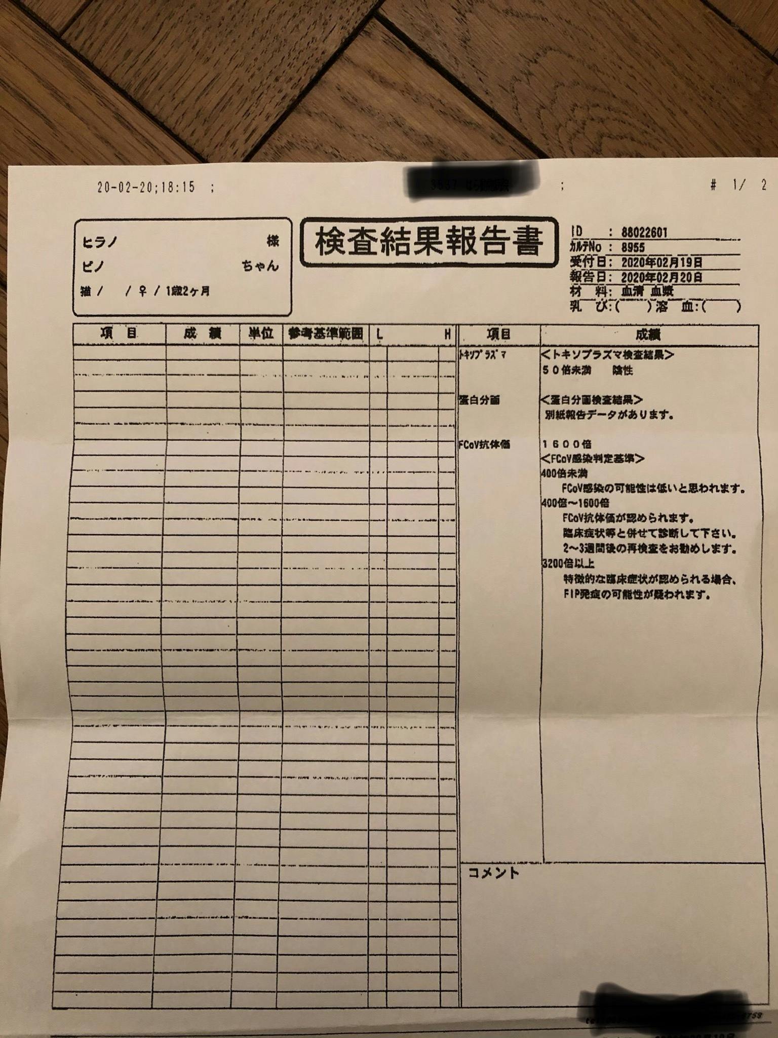 2020/07/07 09:00おはようございます。皆様、お仕事や家事等、お疲れ様です!経過観察49/84日目の、7月3日(金)に、ピノと血液検査に行きました。多くの猫ちゃんは、病院に連れて行かれるのを察知して、キャリーケースに入りたがらないみたいですが、ピノは自ら入っていきます(笑)入った後に思い出すのか、すぐに出ようとしますが、時すでに遅く、私から扉を閉められてしまいました(笑)病院では、毎回採血時に、大暴れするので、「また、迷惑掛けてしまう…」と冷や冷やでしたが、今回は何故か、わりと大人しく、すんなりでした。検査結果を添付します。結果は「再発の兆候なし!」でした。1枚目のPLT(血小板数)と、PCT(血小板クリット値)が【低値】となっていますが、機械で測るとよく起きる測定エラーで、何か身体に問題があるなら、他の数値に異常が出てくるので、心配ないそうです。3枚目の眼の写真は、上が4月2日のもの、下が7月3日のものです。眼球や、毛細血管がくっきりしてきています。FIPドライタイプの症状で発症した、ブドウ膜炎の症状は落ち着いているそうです。改めて、眼が回復していく様子を見ていただきたくて、さらに3枚の写真を掲載しました。 《3月8日》 《3月22日》 《6月21日》こんなに、きれいな眼に戻ってくれて本当に嬉しいです。外注検査に出してもらっていた、炎症マーカーの結果が7月6日に分かり、「基準範囲内」でした。8月に、もう一度検査に行き、再発の兆候がなければ「寛解」できると思います。また、報告をさせてください。最後になりましたが、皆様のご支援や応援で、ここまで来れたこと…言い尽くせない程、感謝でいっぱいです。本当に、ありがとうございますm(_ _)m 平野ピノと家族より もっと見る