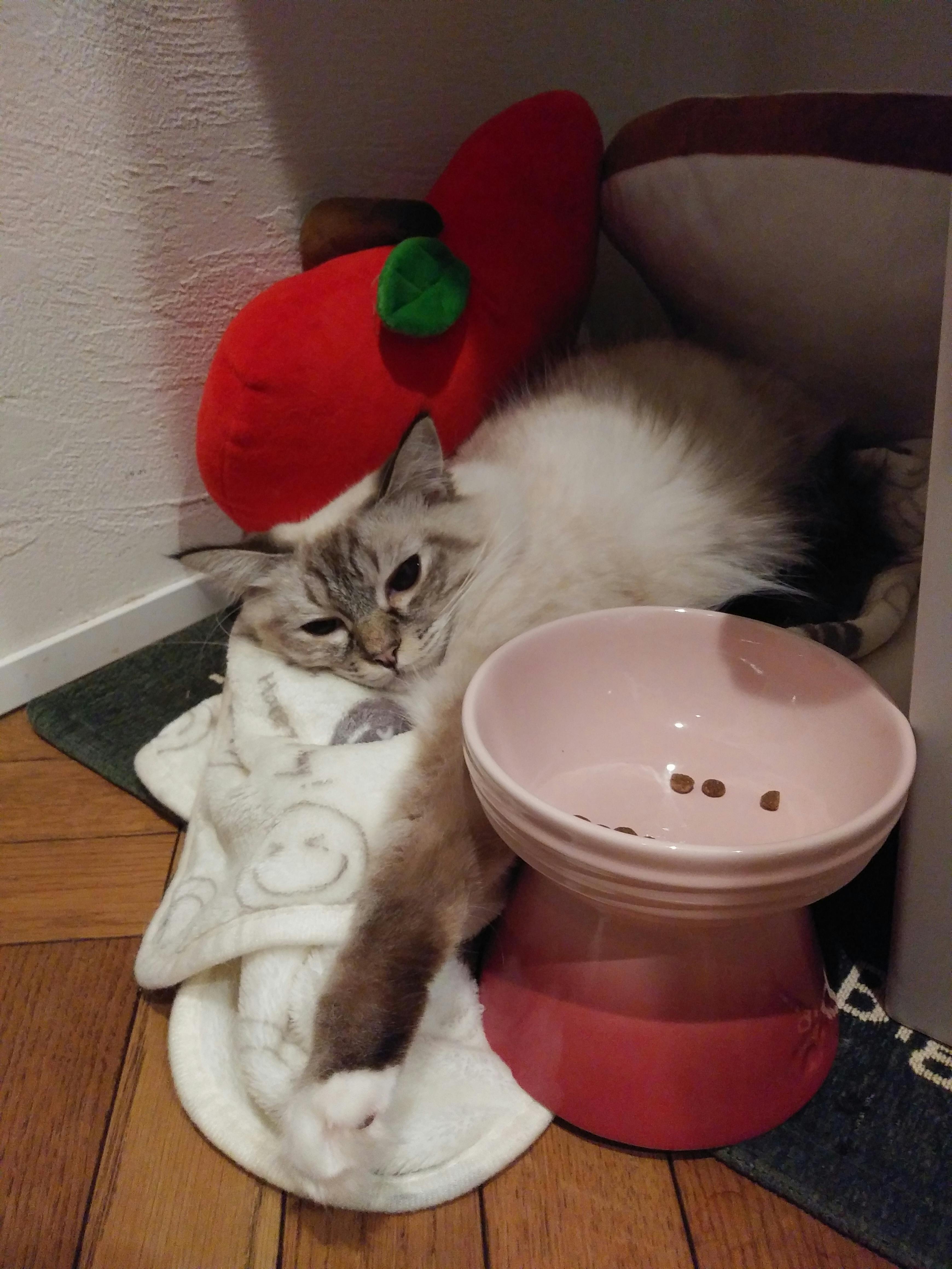 ずっと寝てばかりいて心配だったのですが、さっきは後ろのリンゴのクッションに噛みついていました。ちょっと安心しました。