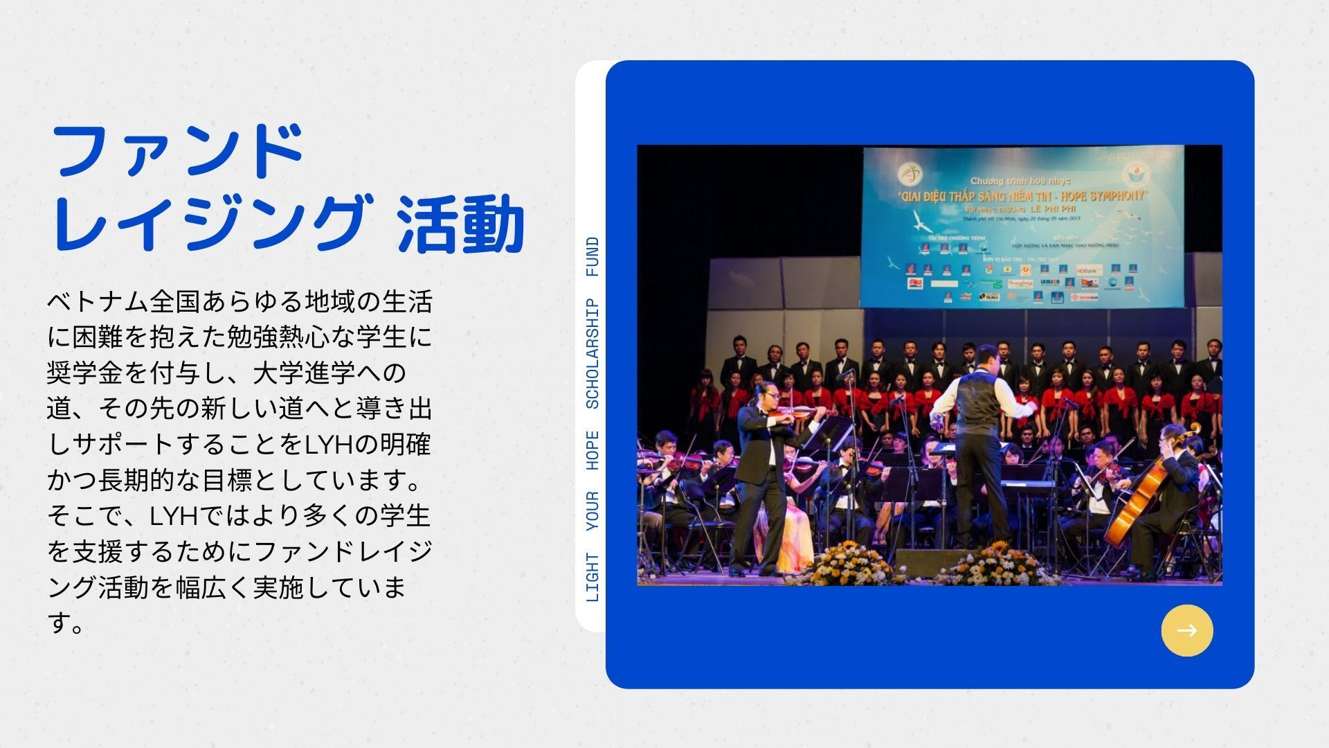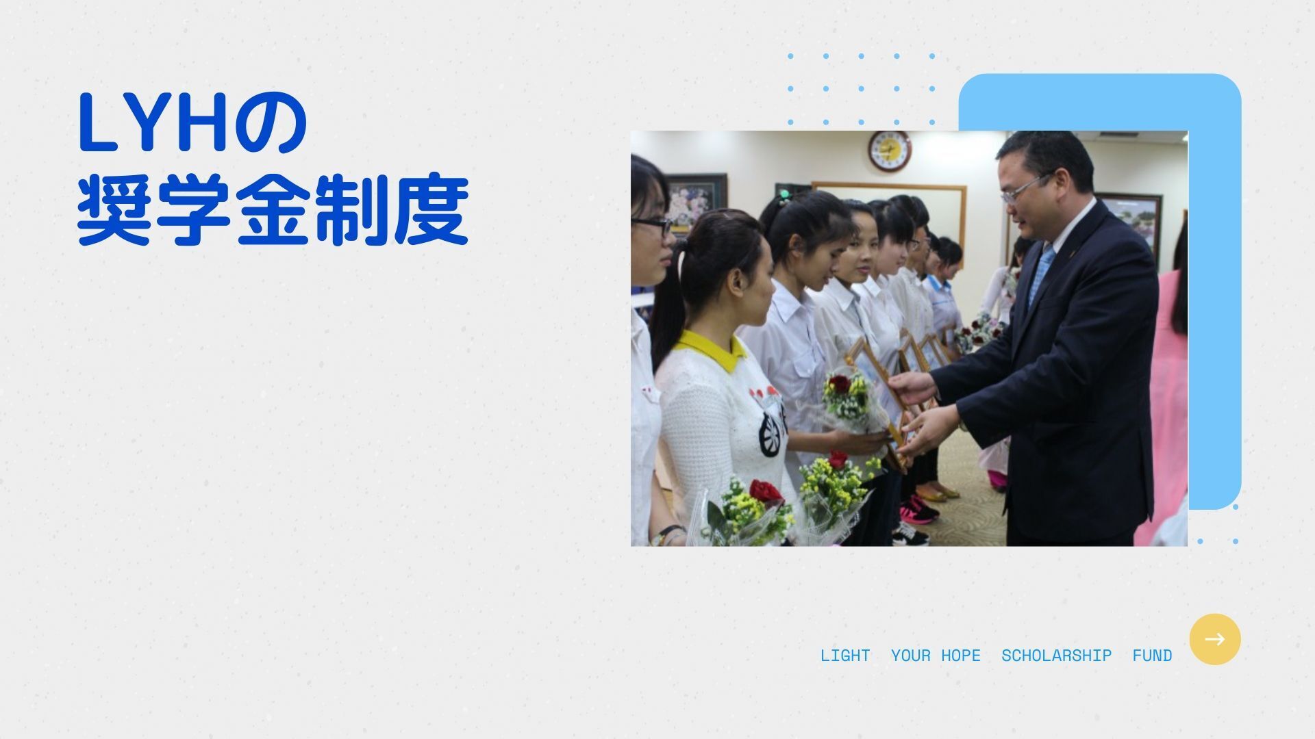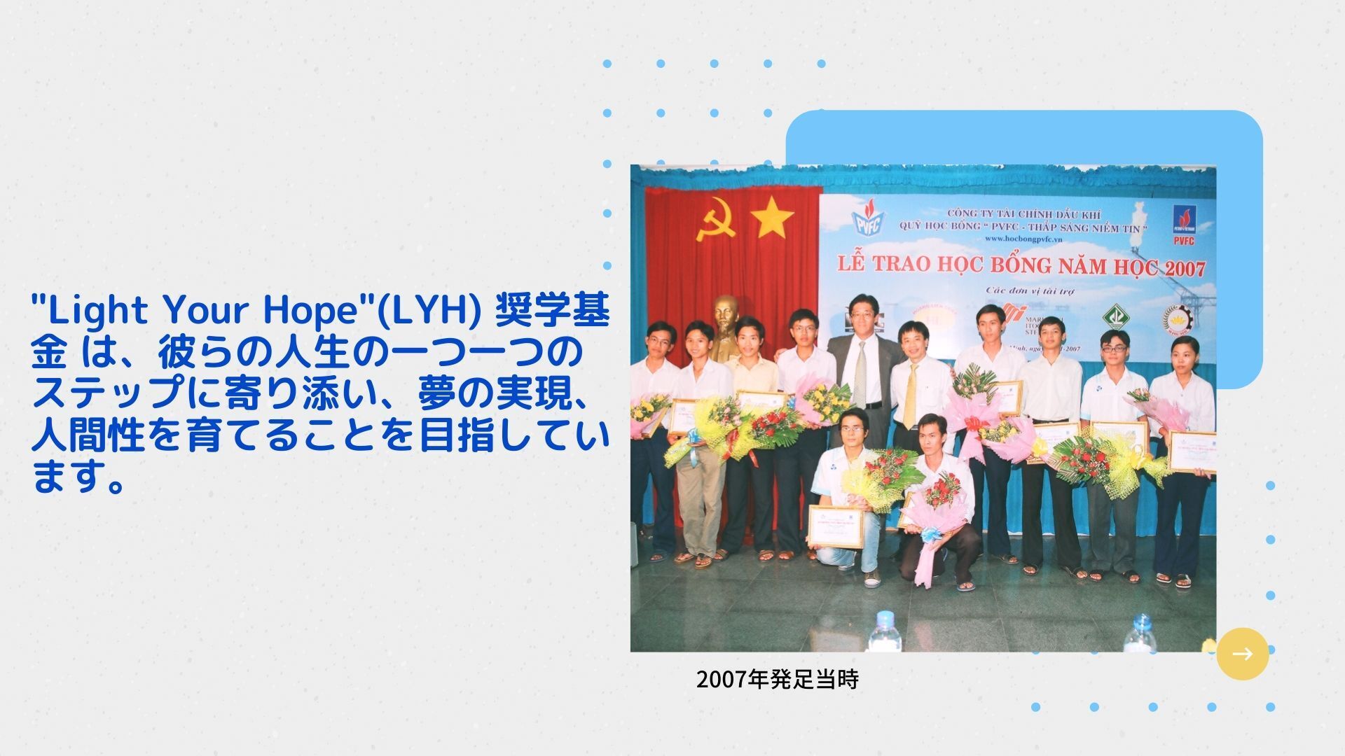 Light Your Hope Scholarship Fund (LYH) はベトナム全国の生活の困窮、戦争の爪痕、地理的条件などあらゆる背景から、自分たちの力だけでは大学へ通えない学生たちへ奨学金を付与しています。LYHはその学生の夢の実現を支え、人間性を育てることで、彼らの人生の一つ一つのステップに寄り添うために2007年に発足されました。