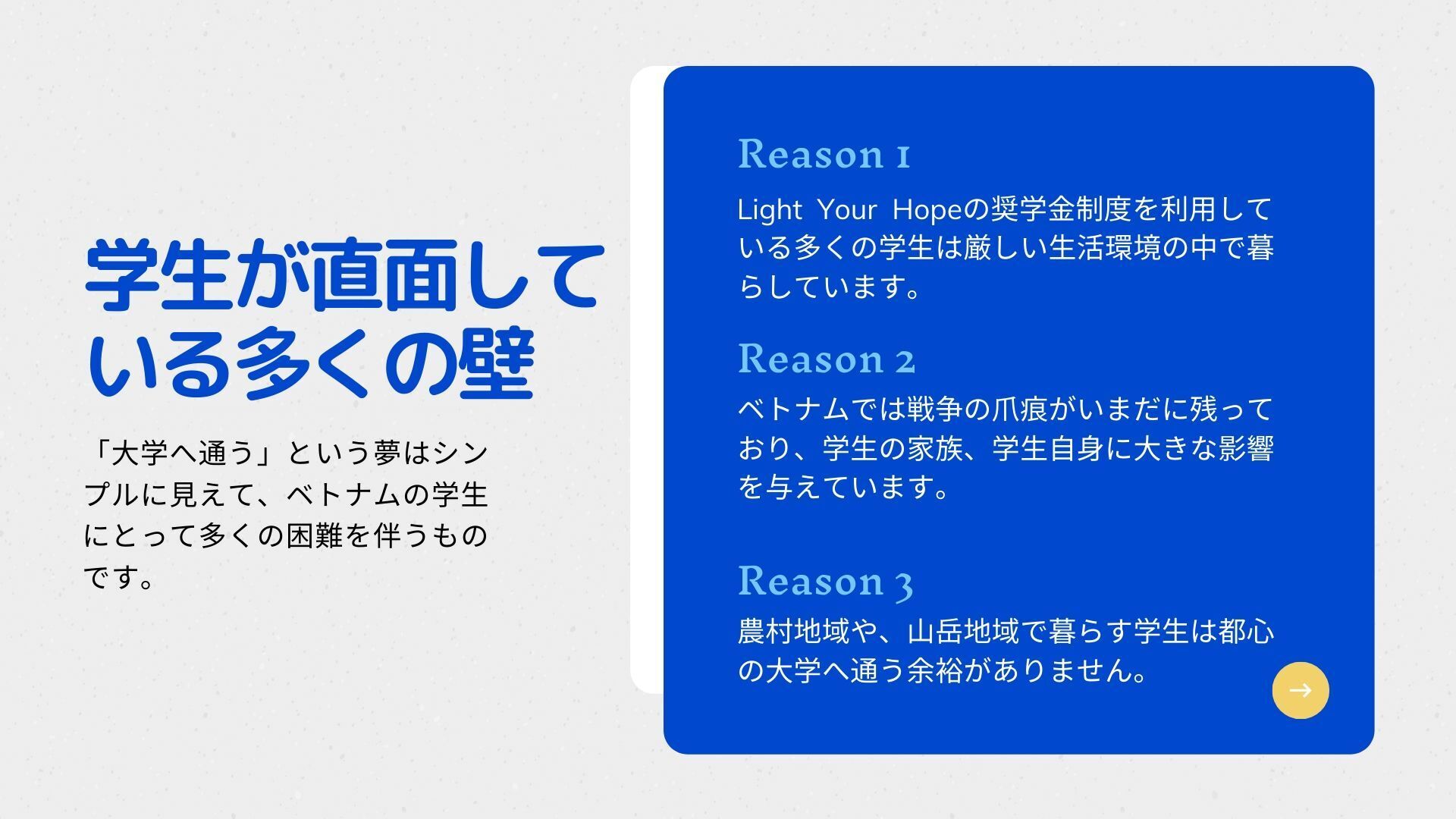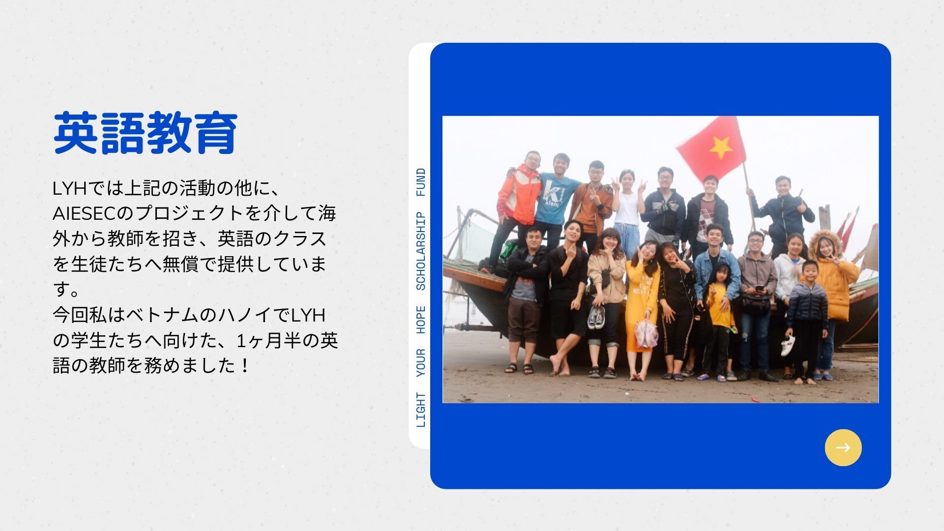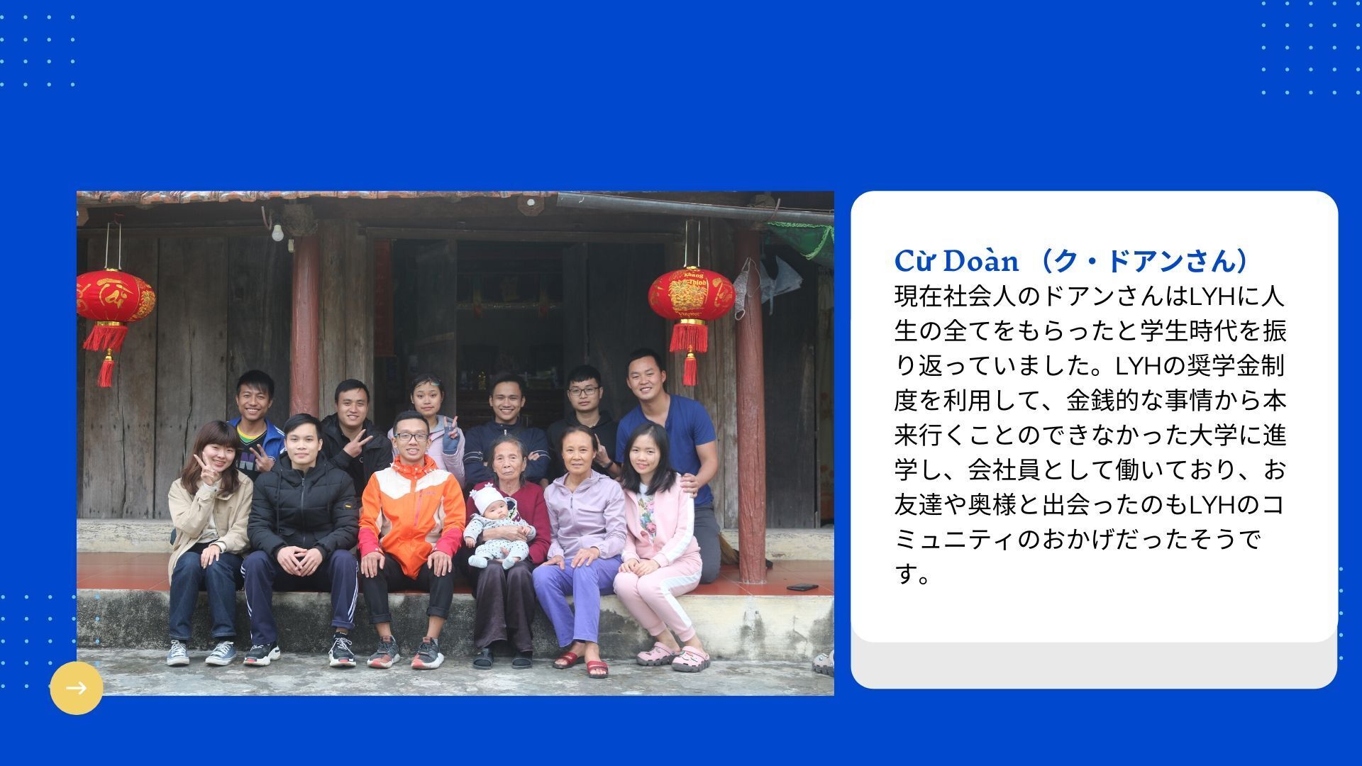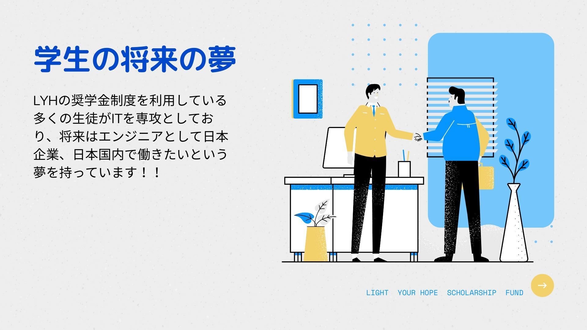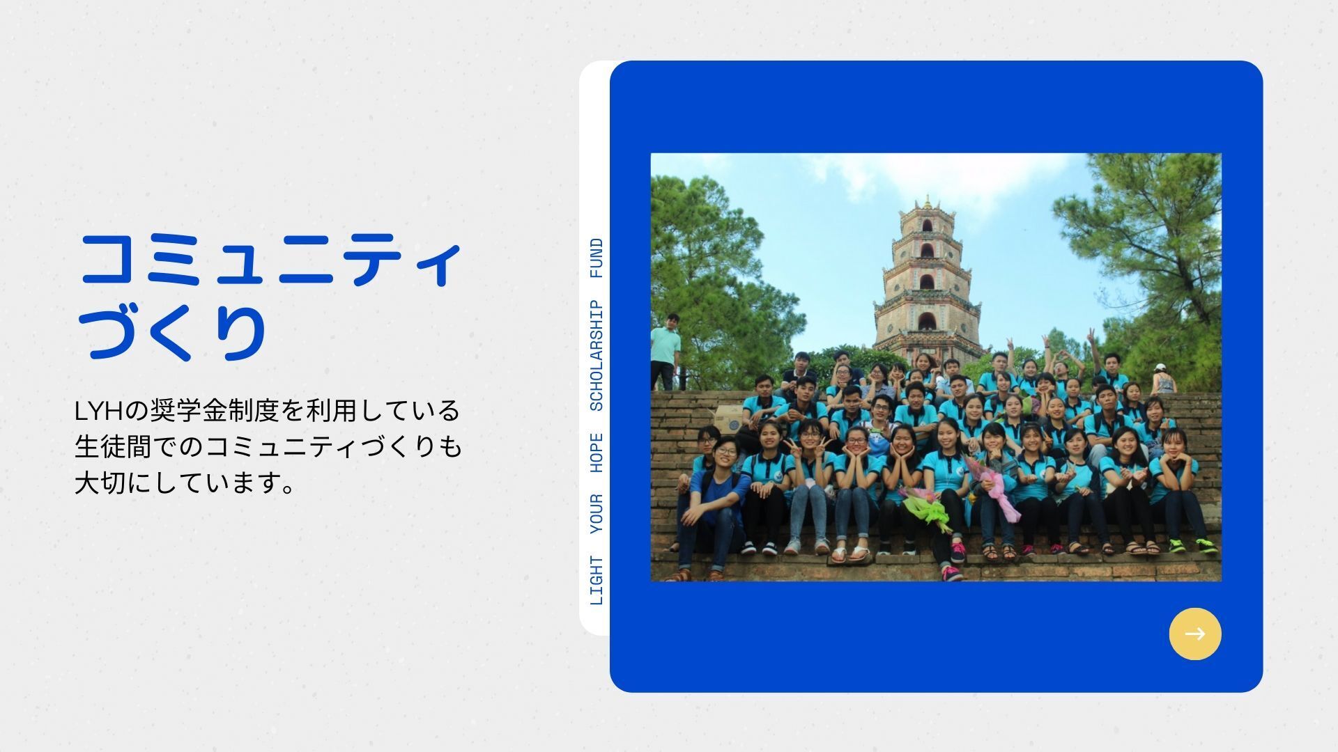 LYHの奨学金制度を利用し、大学へ進学した生徒たちはそれまで自分だけでは導くことが困難であった新しい道を切り開いています。しかし、上記した通り若い世代の多いベトナムにおいてこれからより多くの学生の夢を支えていかなければいけません。そのために日本の方々の支援が必要であると考えました。