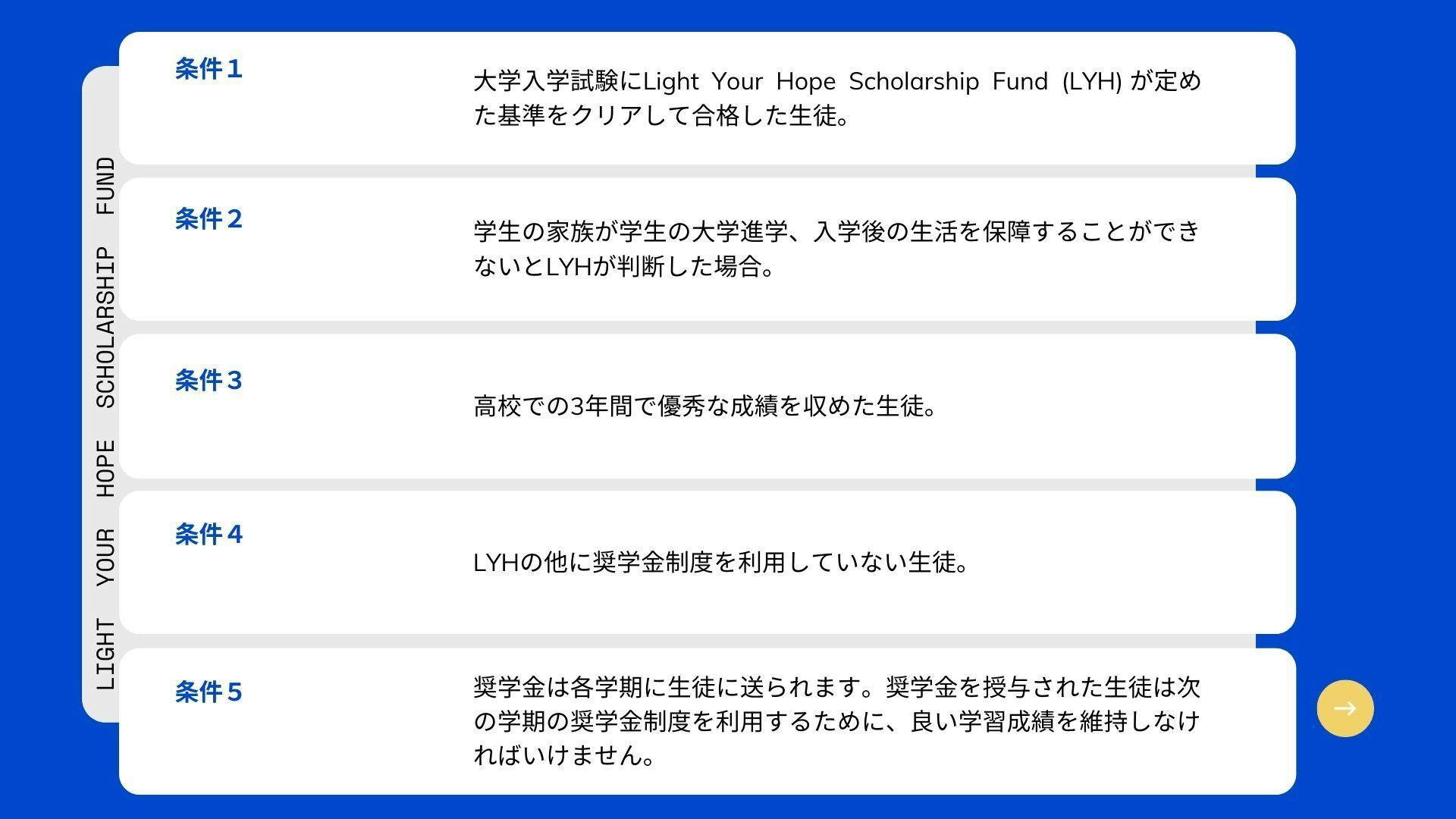 さらに詳しい条件はLight Your Hope Scholarship Fundの公式HPで見ることができます。世帯所得などの公的な証明書とともに、上記5つの条件をLYHメンバーが実際に学生の家族の元を訪れて判断します。