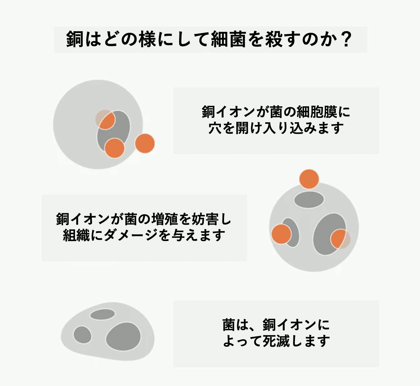 A. 銅が持つ優れた抗菌作用で細菌を減らします。