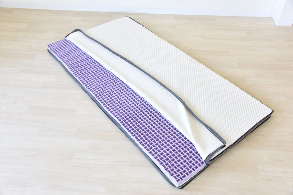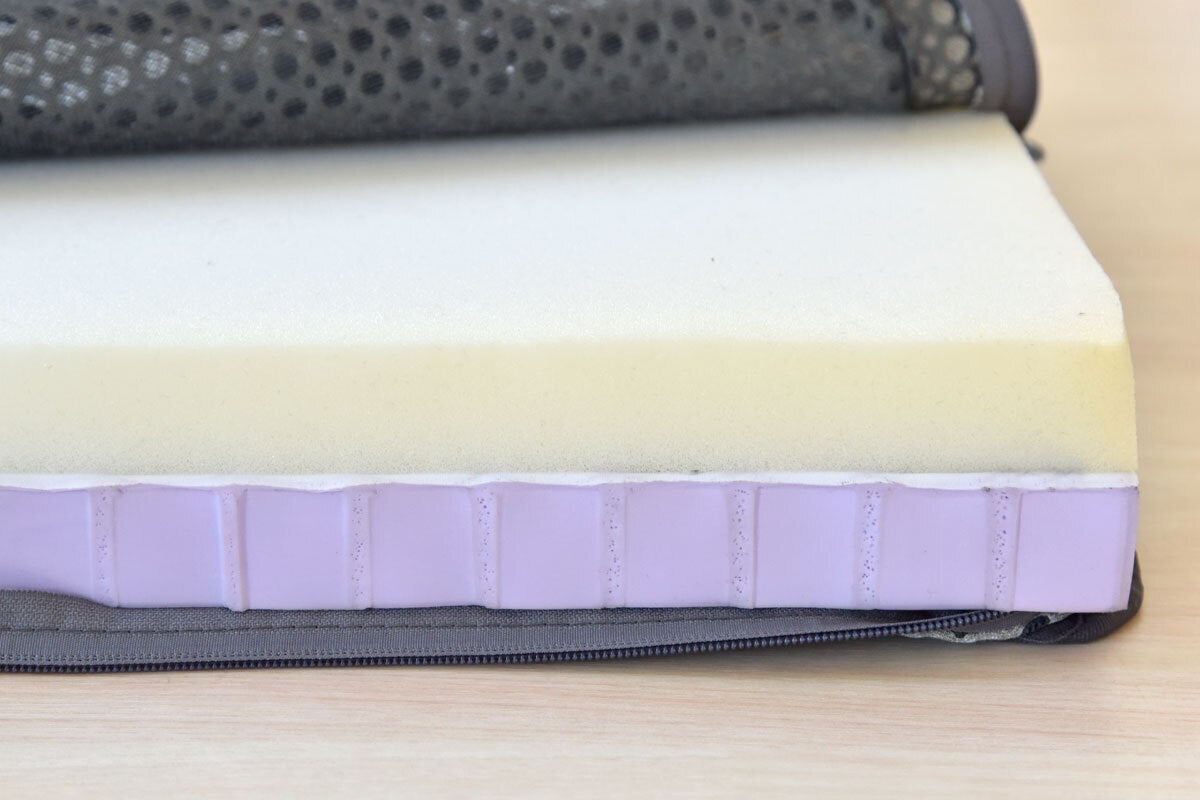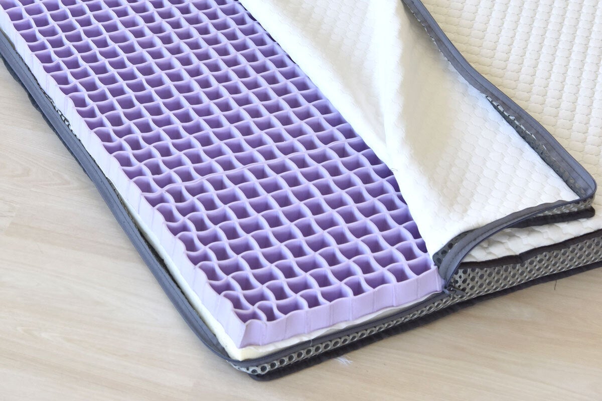 G−Oneグリッドマットレスはリバーシブル。高反発のTPEと低反発のウレタンフォームの組み合わせなので、裏返すと低反発のモッチリ感も味わえます。