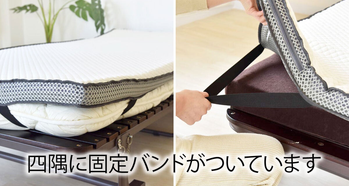 四隅に固定バンドがついています。20cmの厚みがあるマットレスまでしっかり固定できます。