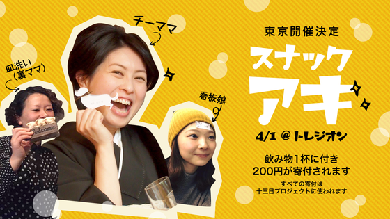 スナック・ファンディングを東京赤坂のトレジオンにて行いました! 盛岡に引き続き、東京でも「十三日」の説明を兼ねたスナック・ファンディングを開催しました。 18時のオープンから23時まで満席が続き、37人の方々に来ていただくことが出来ました。皆さんに「十三日」を応援しています、出来たら必ず行きますねと言っていただき、本当にありがたかったです。 会場のトレジオンが岩手の食材をメインに扱っていたり、数多くの岩手に関するイベントを行なっているところなので、岩手のために何か協力したいという方が沢山いらしていただきました。 ご協力して頂いたトレジオンのスタッフの皆さま、お手伝い頂いたヨハクデザインの武田さん、看板娘のユイちゃん、クミさん、そして募金を頂いた皆さま、ありがとうございました。