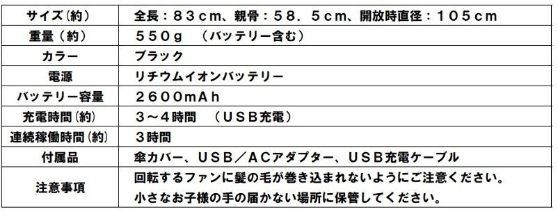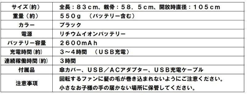 完全に傘を開かないとファンが回らない安全設計。