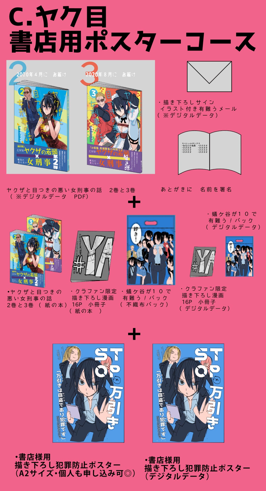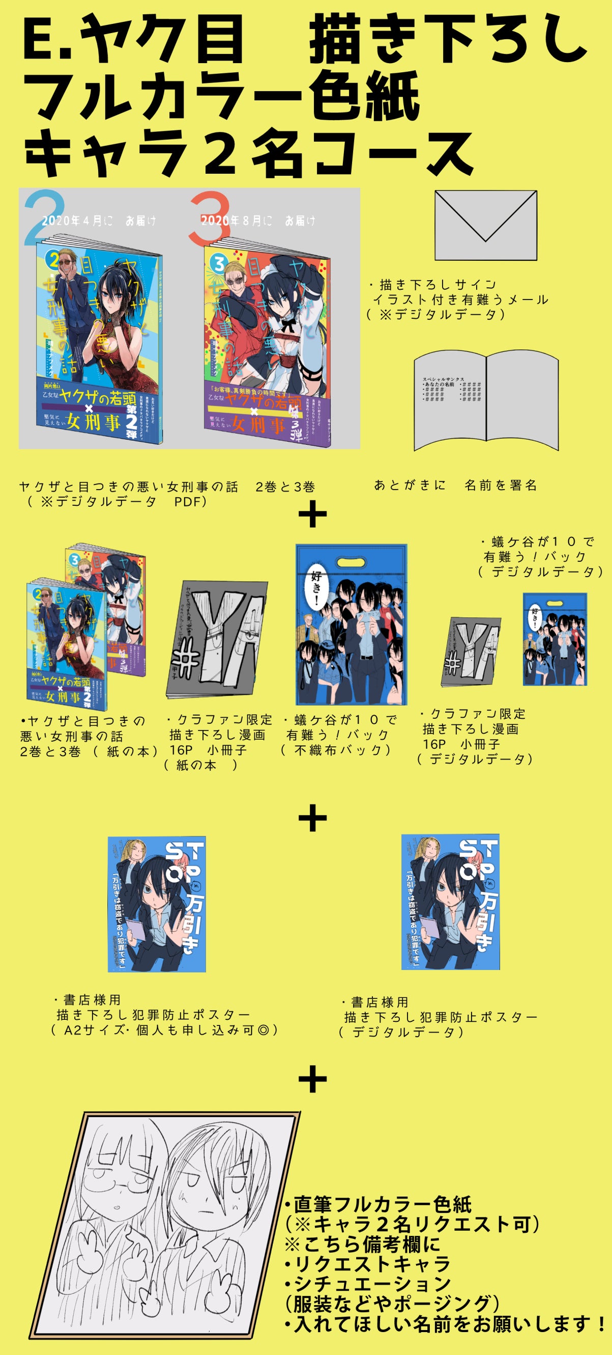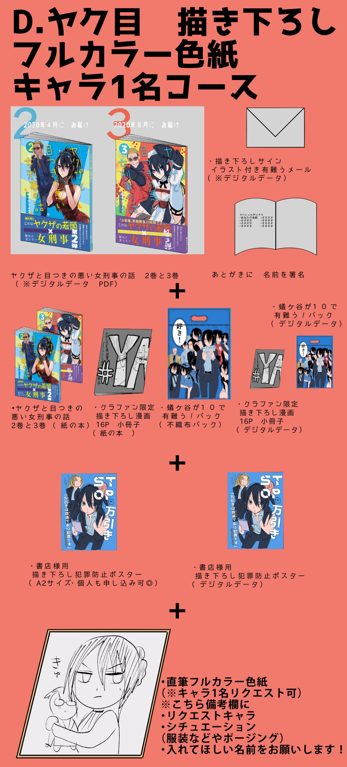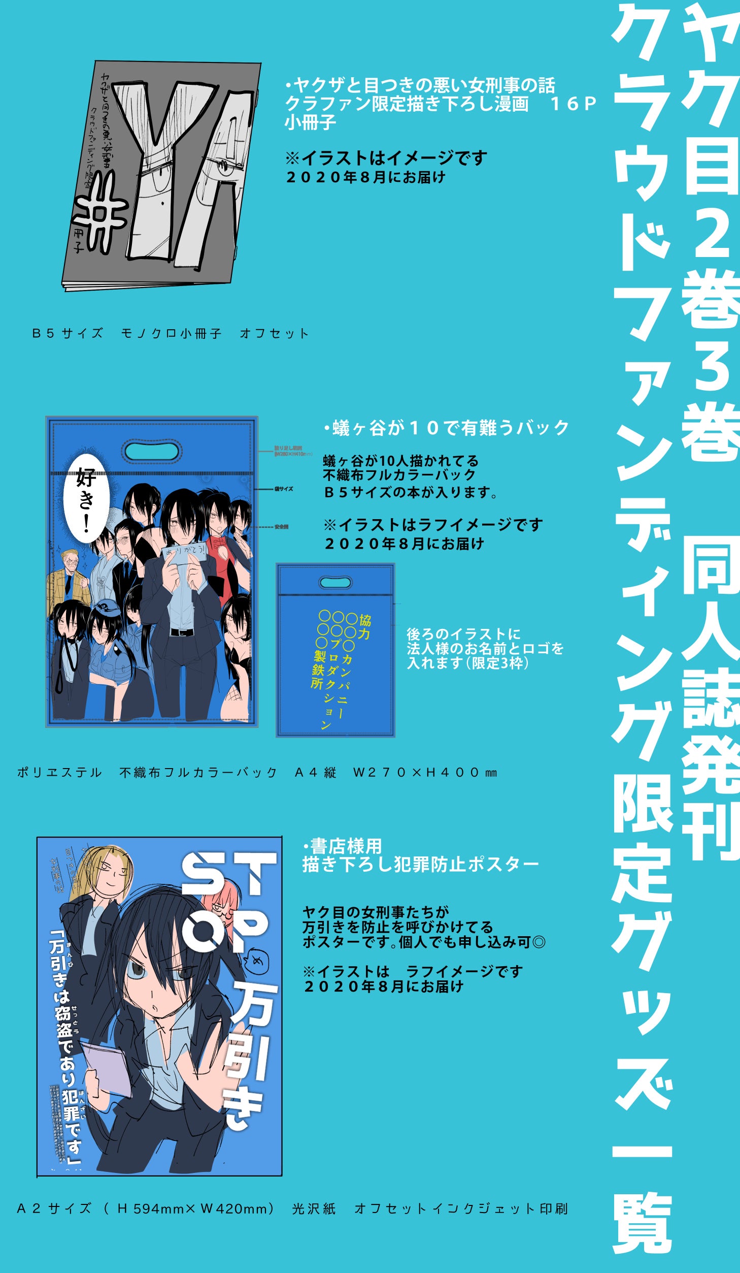 2020年8月31日 「ヤクザと目つきの悪い女刑事の話3巻」「クラウドファンディング限定 ヤク目漫画16Pモノクロ小冊子」「蟻ヶ谷が10で有難うバック」「書店用・万引き防止ポスター」 「D~Eプラン直筆フルカラー色紙」順次発送