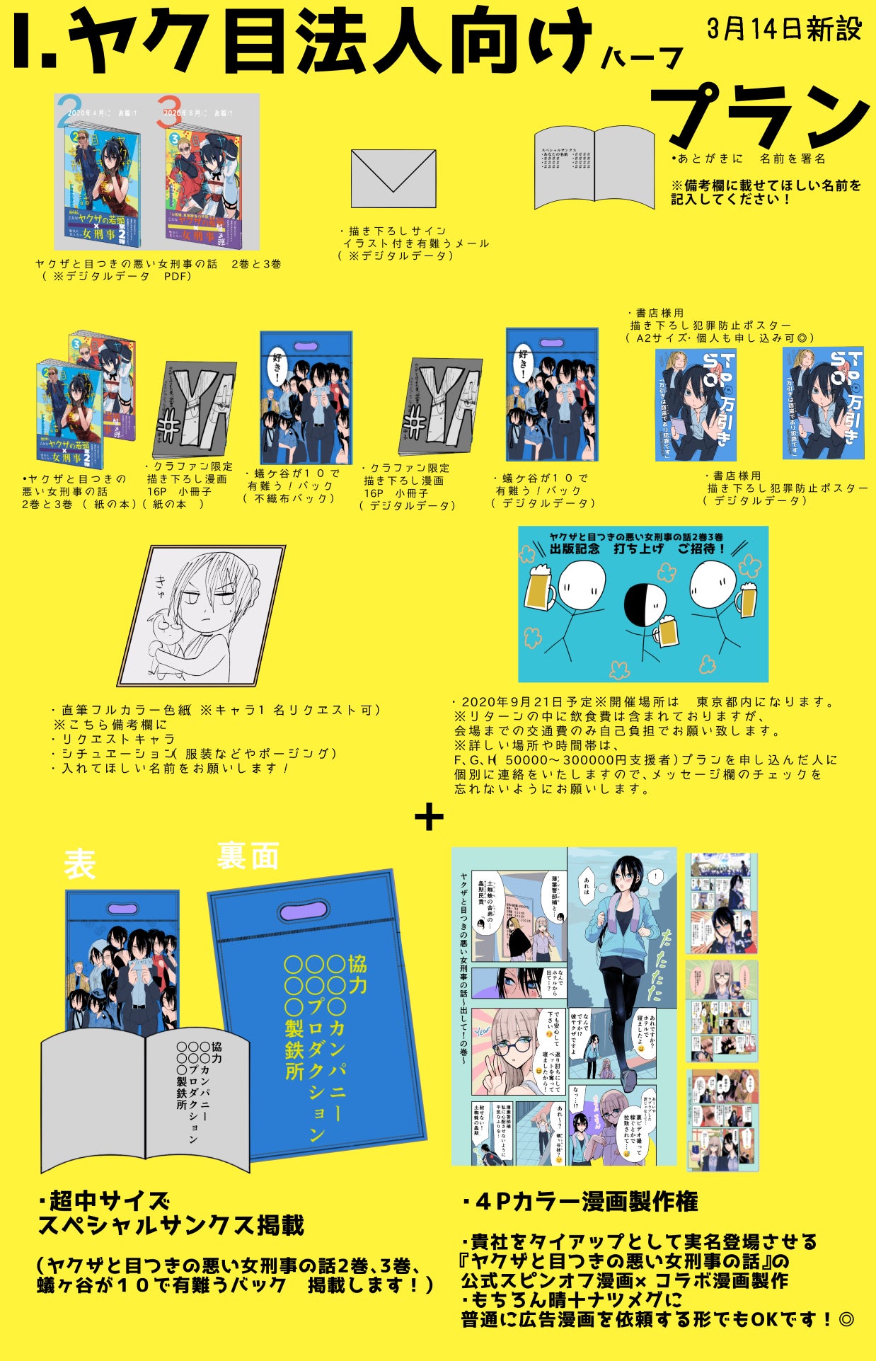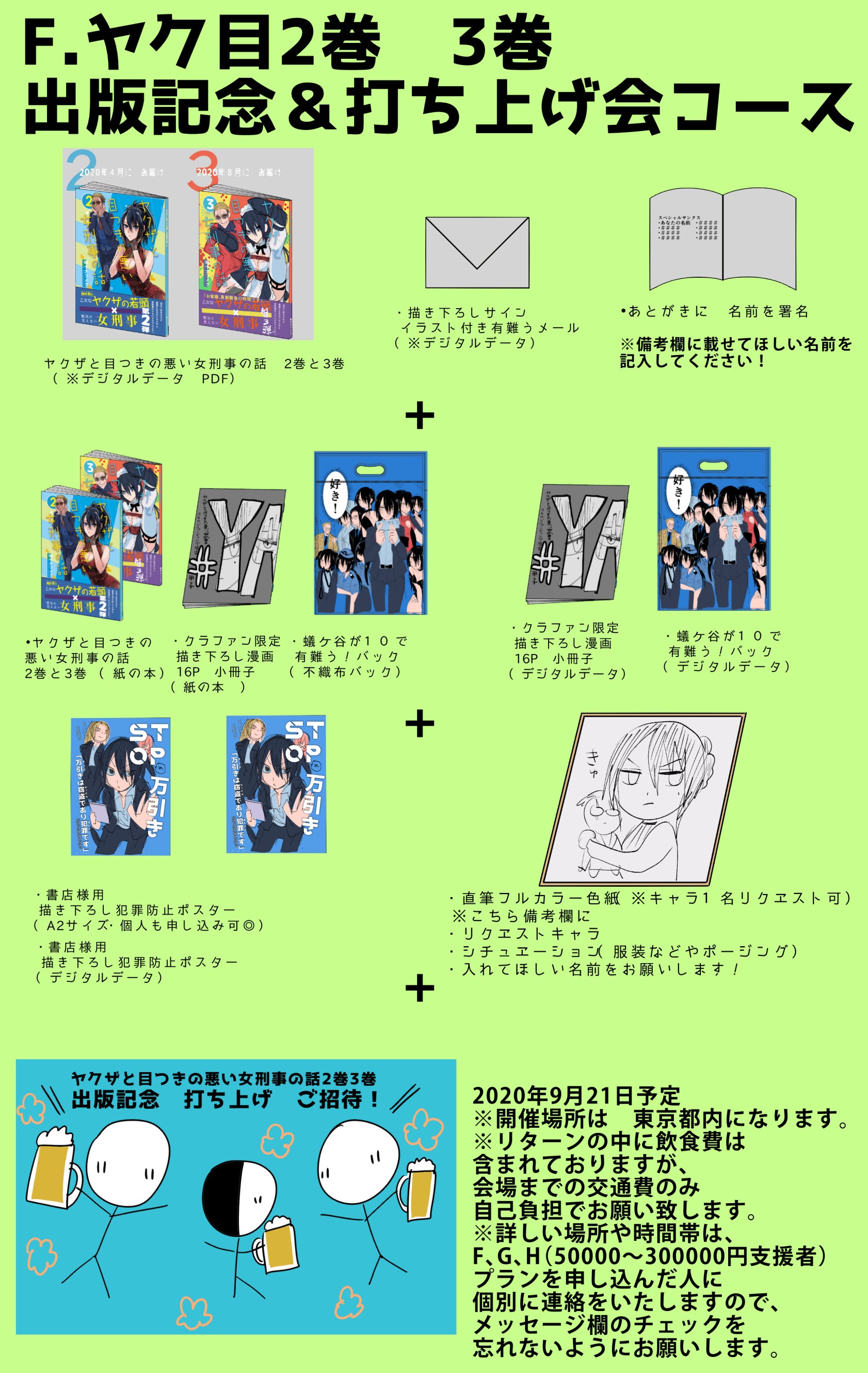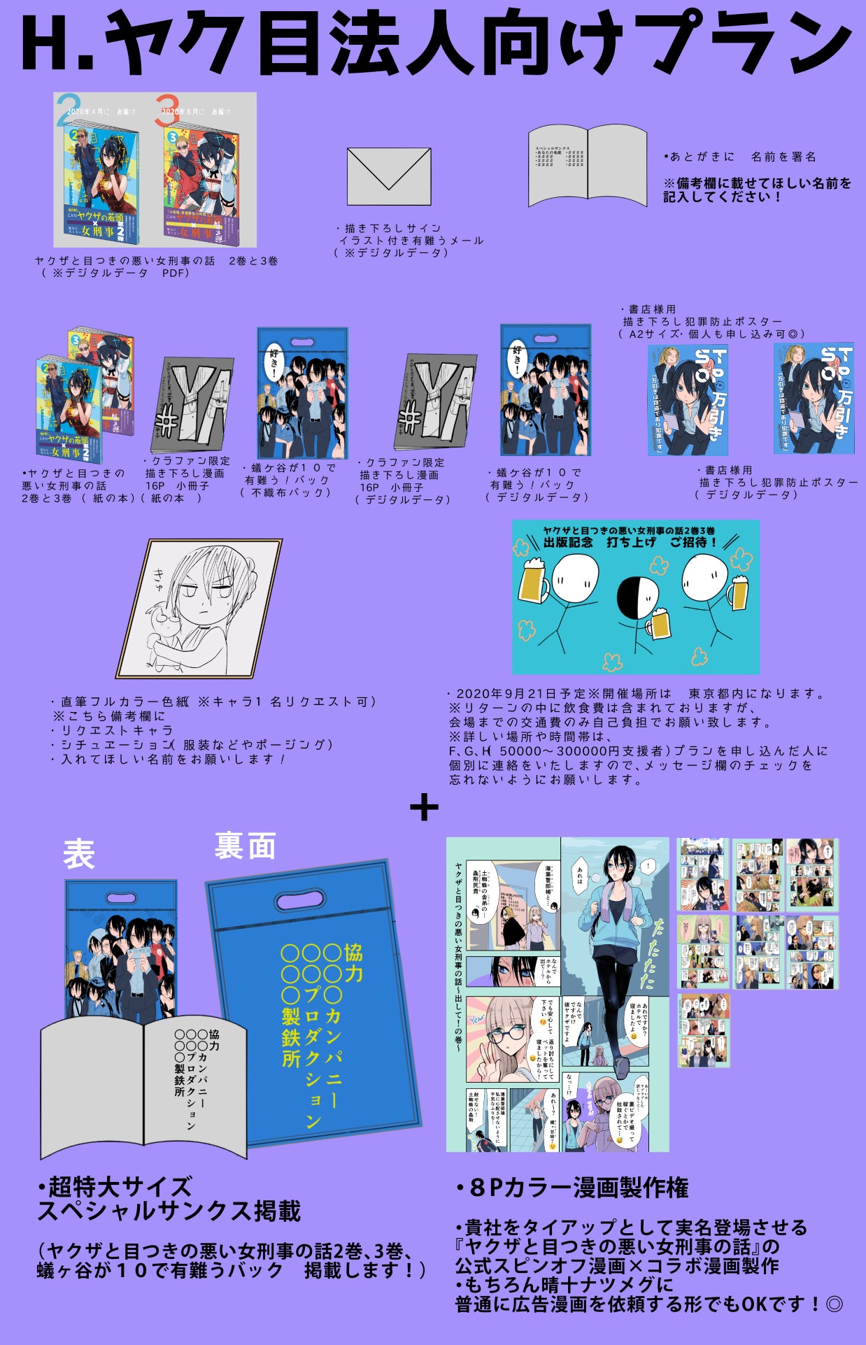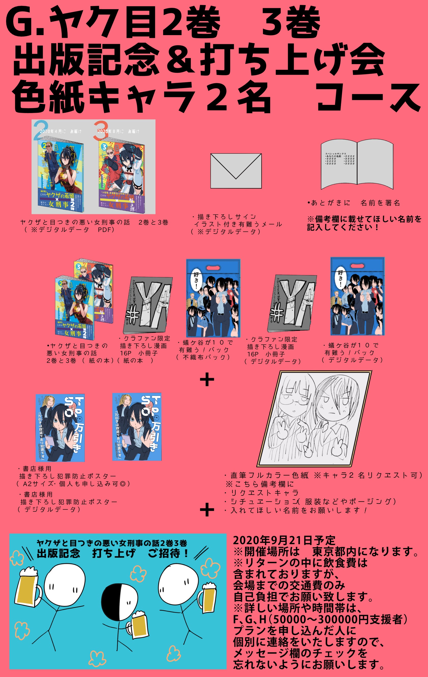 2020年8月31日 「ヤクザと目つきの悪い女刑事の話3巻」「クラウドファンディング限定 ヤク目漫画16Pモノクロ小冊子」「蟻ヶ谷が10で有難うバック」「書店用・万引き防止ポスター」 「D~Eプラン直筆フルカラー色紙」順次発送