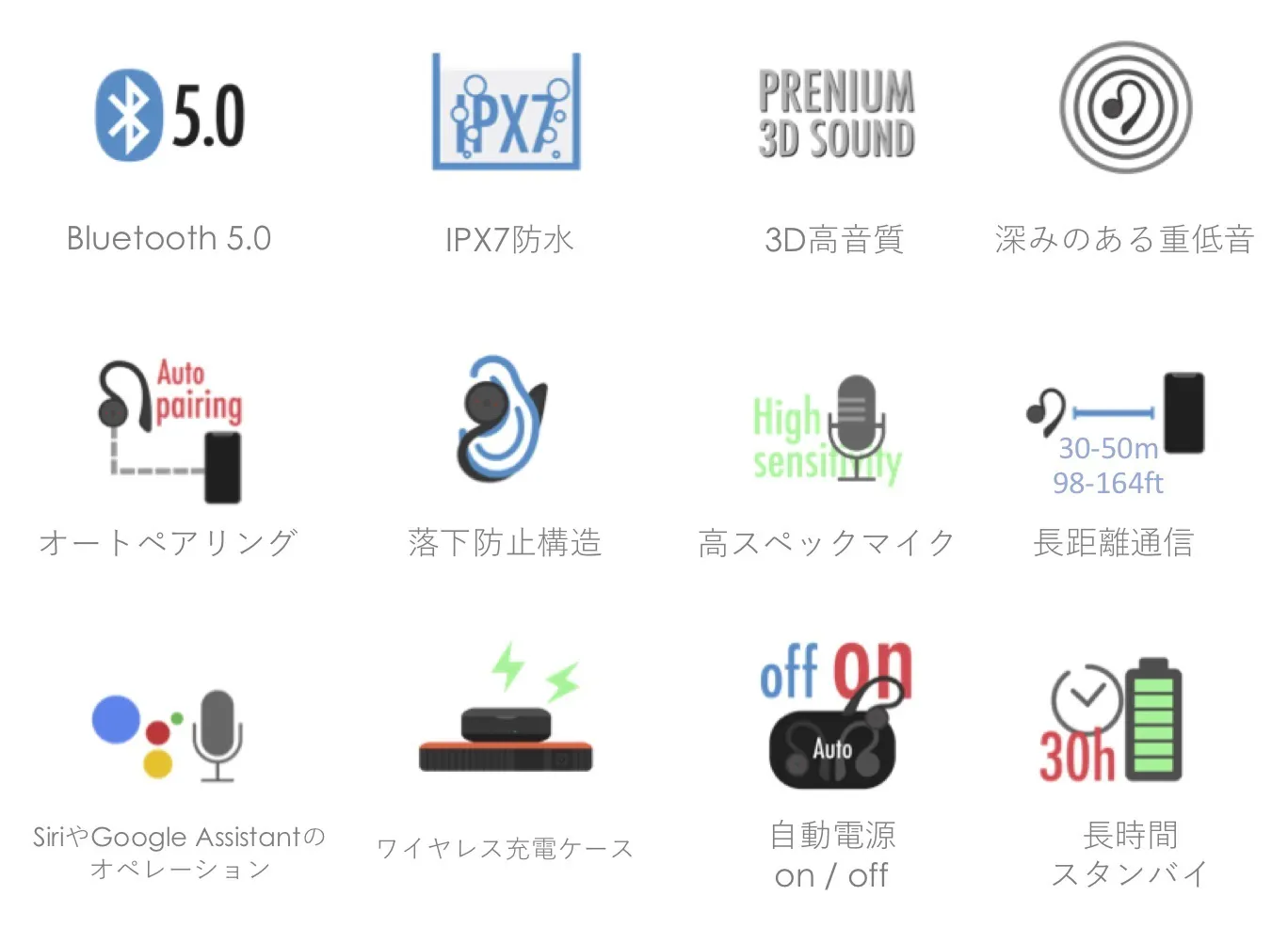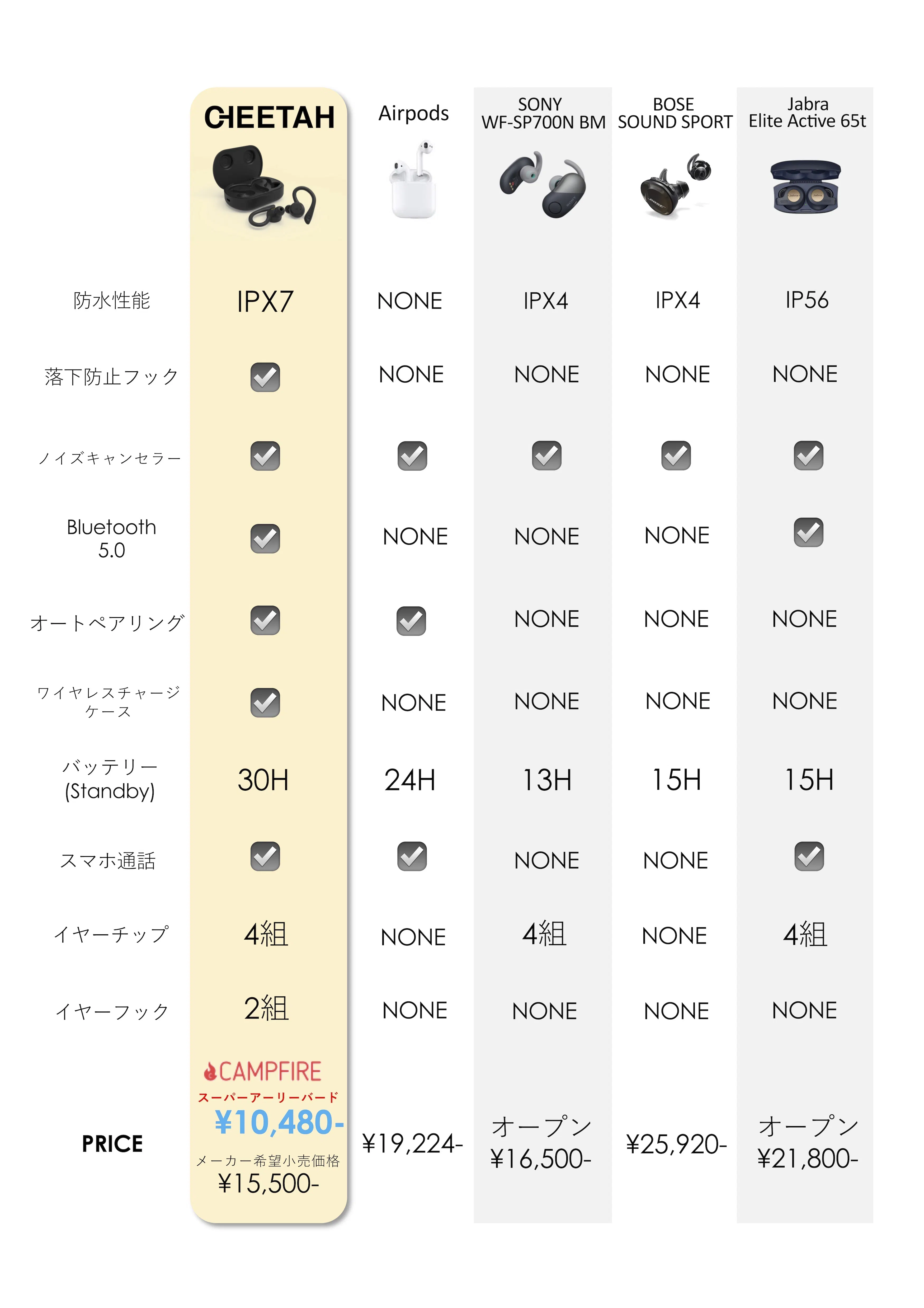 パルクールをしても、ダンスをしても、水泳をしても、CHEETAHは落ちません。「落ちないイヤホン」に、IPX7完全防水、3D高音質、Bluetooth5.0、ワイヤレスチャージケース、その他様々な機能を搭載しました。また、最新テクノロジーのAIROHA1532チップセットを搭載しており、ペアリングデバイスとの通信距離は30m以上!実験では最大50mの実績もあります! 当プロジェクトを計画していた段階では、AIROHA1526Pチップセットを搭載する予定でした。AIROHA1532とAIROHA1526Pの大きな違いは、通信距離と音質です。音質を言葉で説明するのは非常に難しいのですが、非常にクオリティの高い立体感のあるサウンドを体感していただけます!