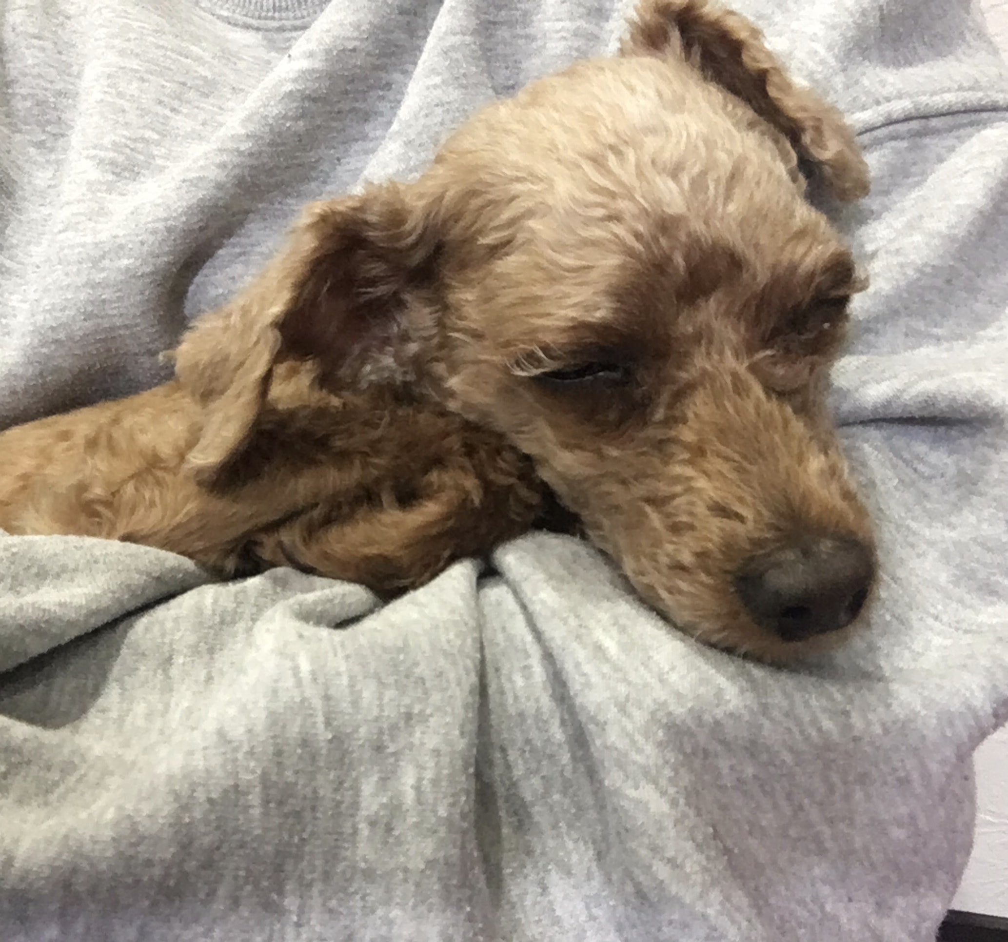 今は、シャンプーカットがマンゴーの負担になりますので、頻度を減らす為に1ミリカットにしていて、プードルに見えませんが、可愛く私の腕で眠っています♡