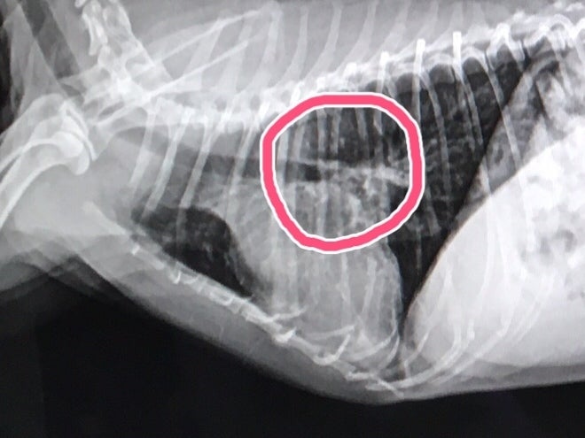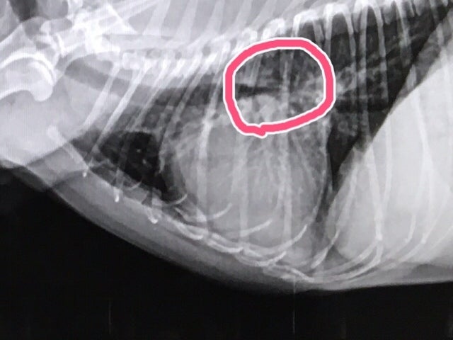 心臓の上に気管が通っているのですが、大きくなりすぎた心臓が、気管を押し上げて、気管がつぶれてしまっています。