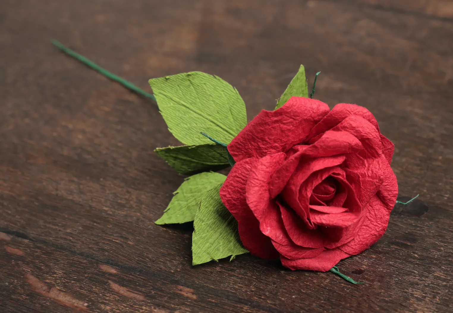 この赤いバラは、1500年の歴史を持つ伝統工芸品「越前和紙」で作られています。私たちの会社がある福井県鯖江市の和紙フラワーショップ「AI-LI (あいりぃ)」さんが、花びら一枚から丁寧に一本一本手作りした、半永久的に飾っていただけるお花です。