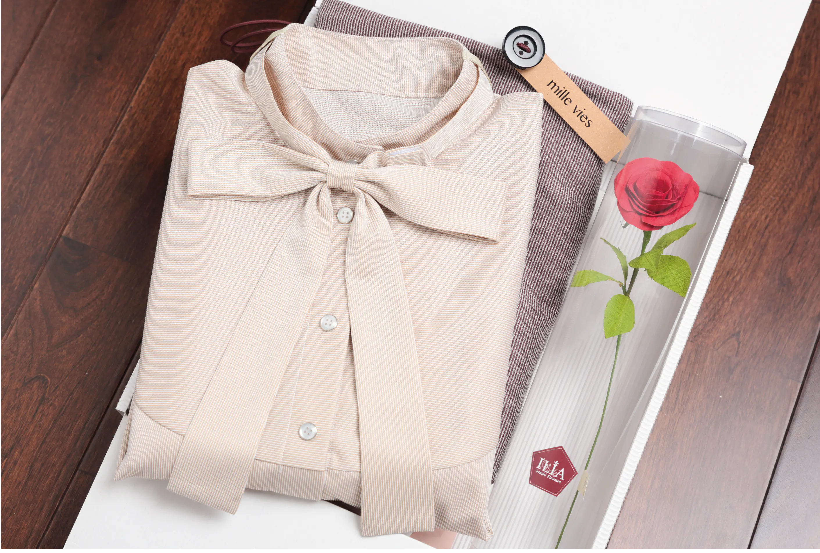 今回は母の日に合わせて、ミルヴィー上下セットに加えて、和紙の赤いバラ、感謝のメッセージカードを添えてお届けします。