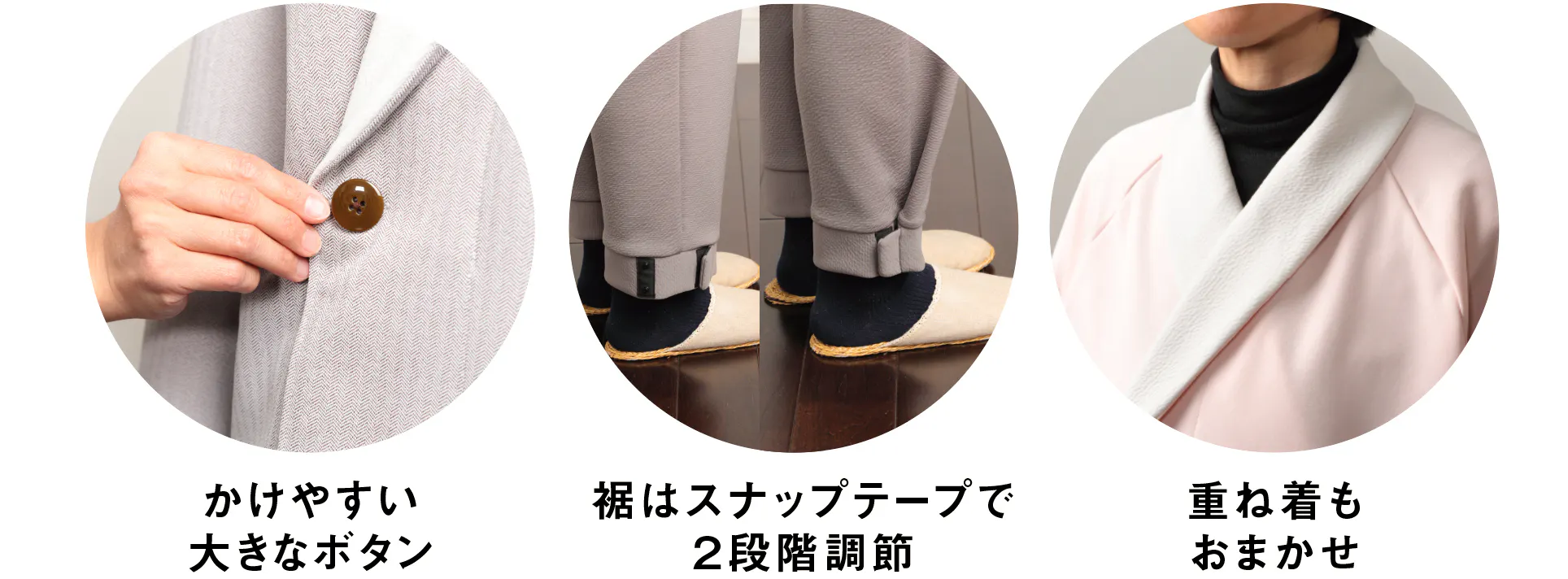 パンツは裾がすぼまったデザインで、スナップテープで2段階調整できます。