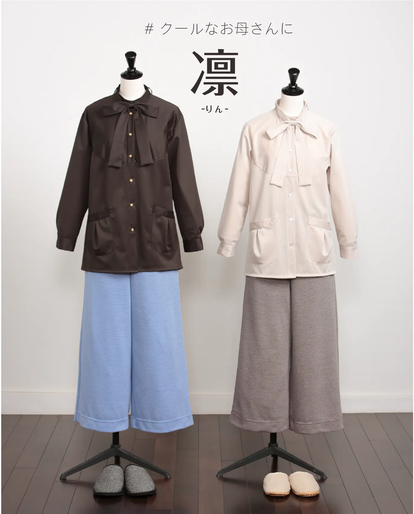 クールでかっこいいお母さんへ。リボンはマジックテープで簡単取りはずし。急な来客のときは、付属のリボンをつければおしゃれでキチンと感が出ます。ワイドパンツはポケット付き。伸縮性があって動きやすい仕様です。階段の上り下りや、お出かけもお任せ!