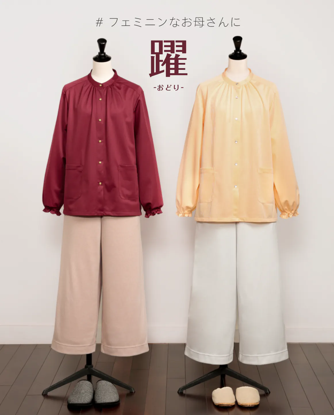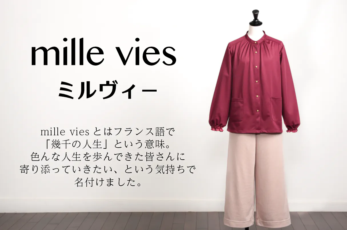 私たちは「いつまでもキレイでいたい」「毎日をイキイキと過ごしたい」と願うお母さんたち、そしてお母さんの幸せを想うあなたに、オシャレで機能的なルームウェア mille vies(ミルヴィー)をお届けします。お母さんにいつまでも元気でいてほしい、そんな親を想う気持ちをカタチにした、今までにないルームウエアです。