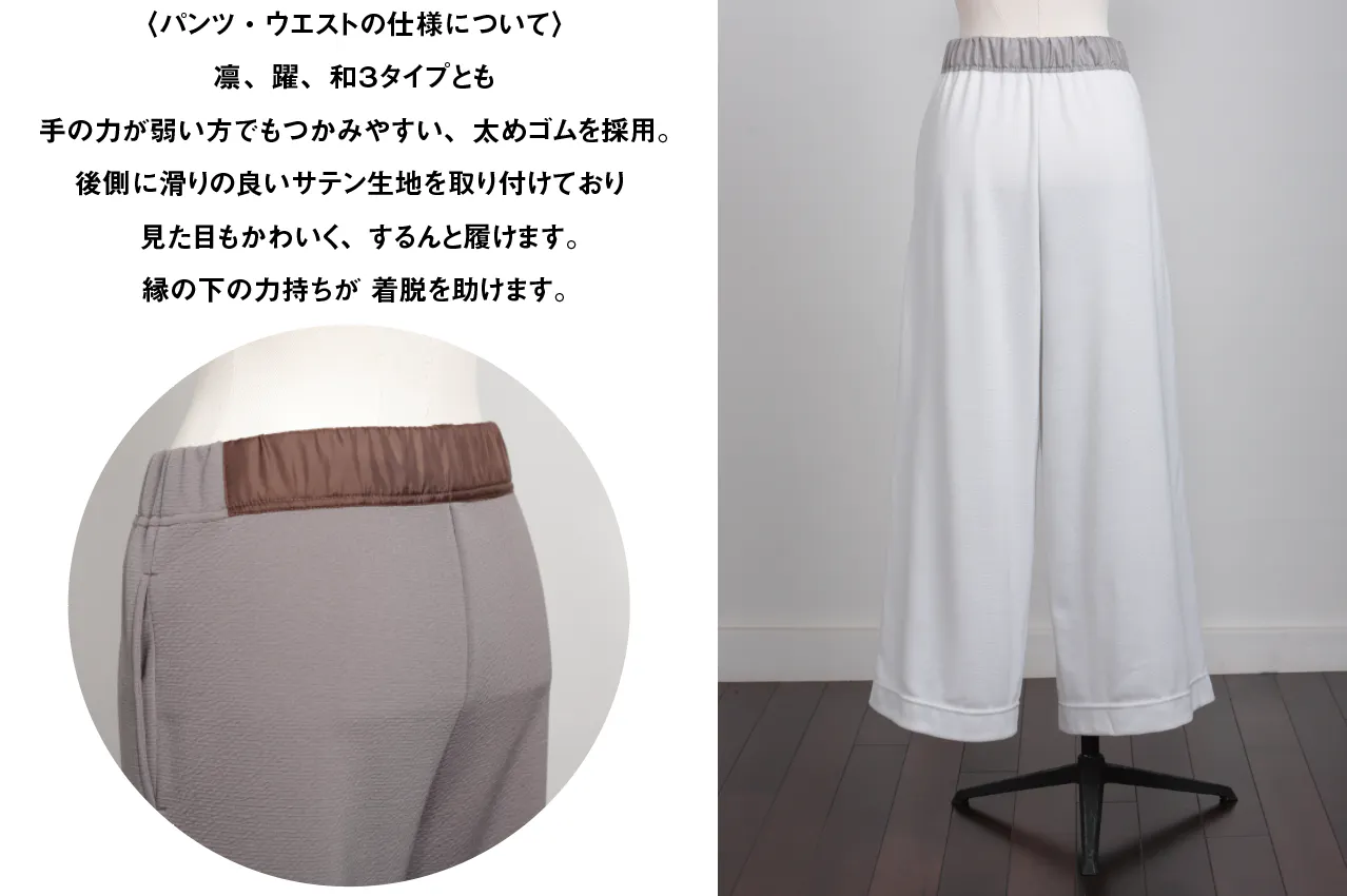 ポケット付きのパンツは、歩くことが楽しくなるような動きやすさです。