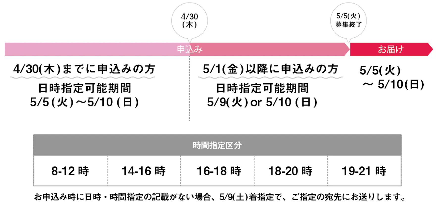 ・5/1(金)以降に申し込みの方は5/9(土)~10(日)で日時指定可能