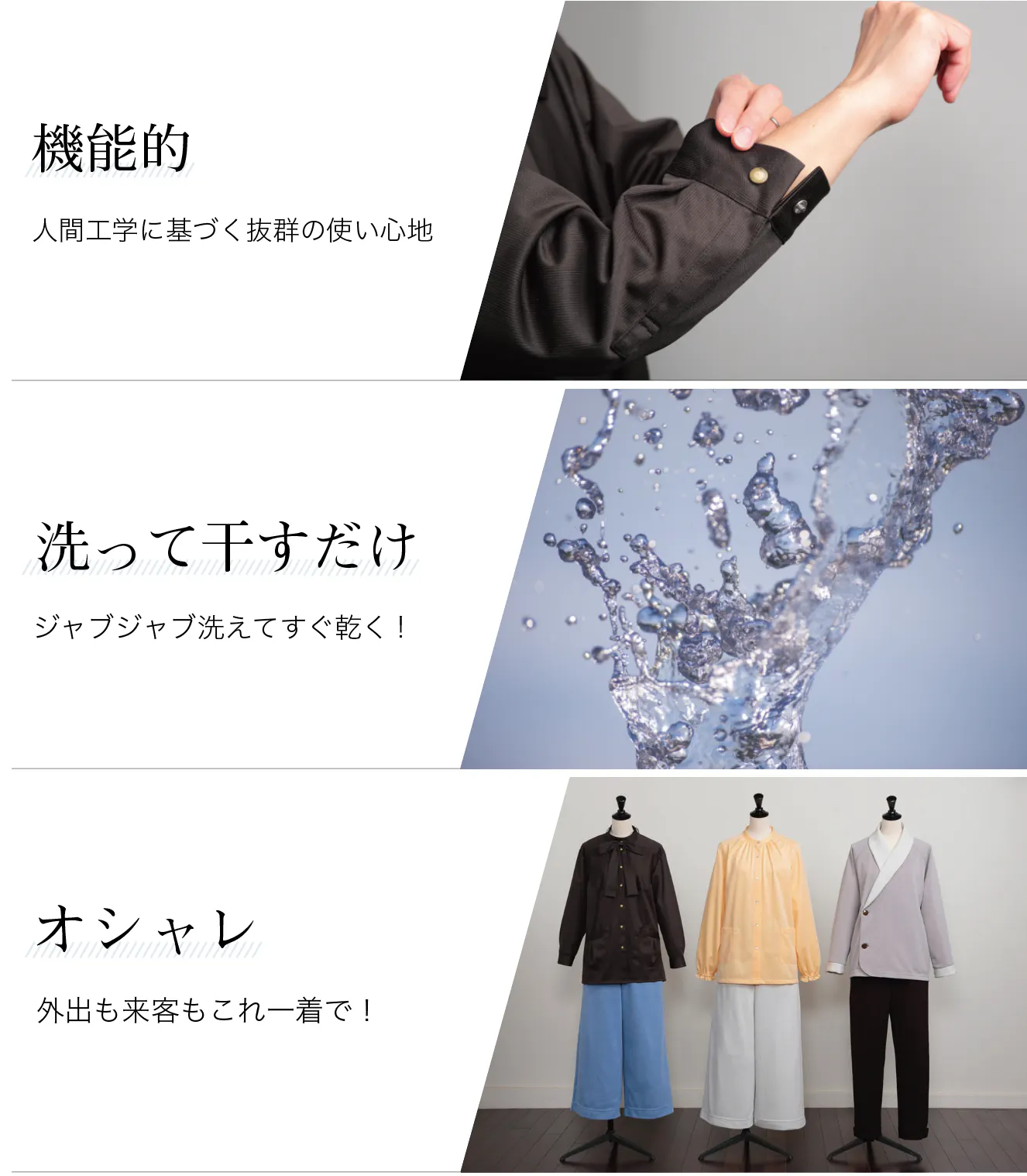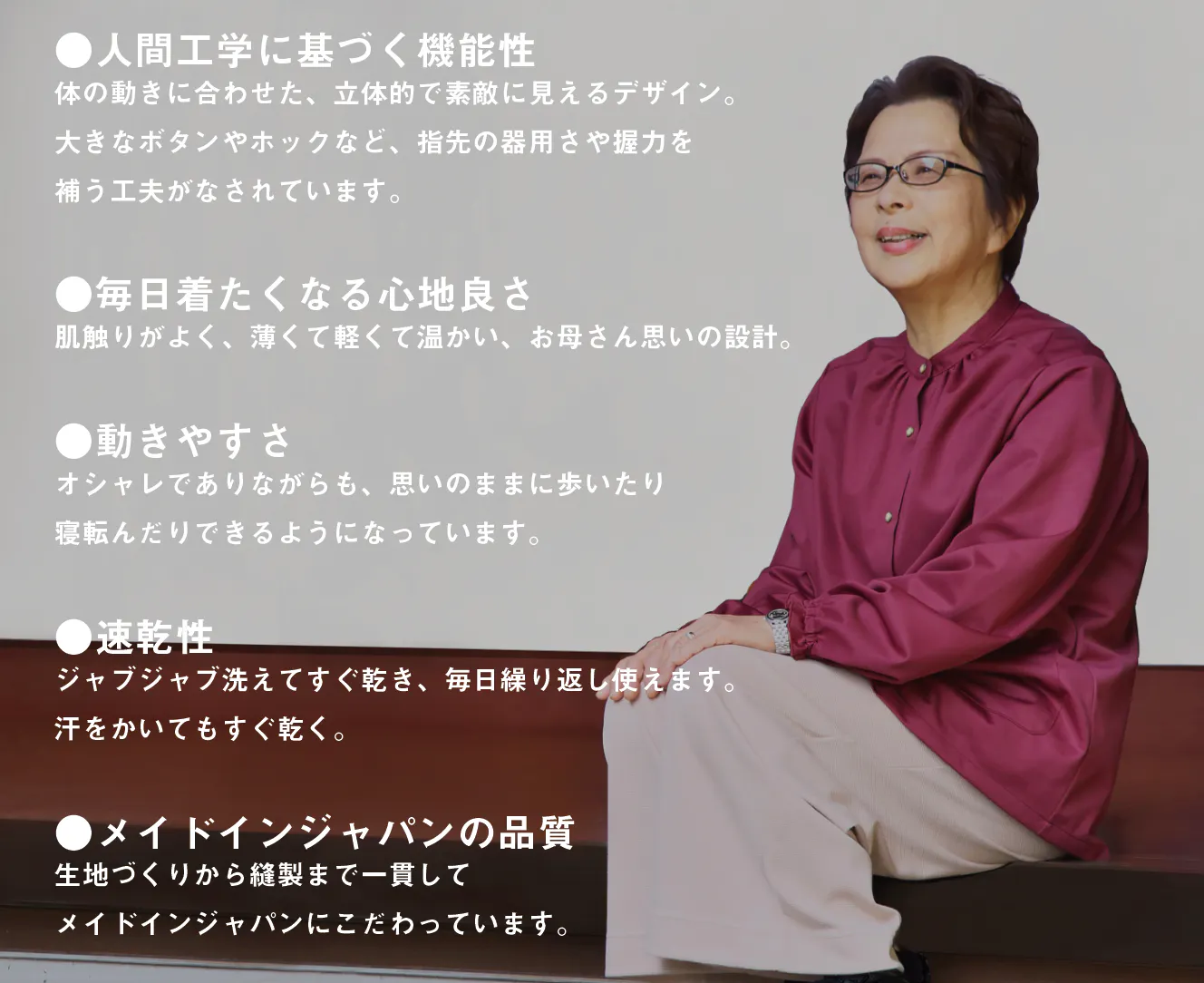 ・シニア向けというと、急に野暮ったくなったり袖丈が長すぎたりするけれど、これはよく考えられていますね。(70代女性)