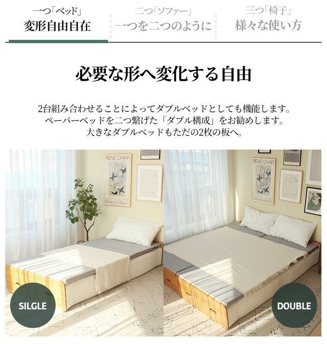 ペーパーベッドはそのきっちり整えられた形により2台をぴったり組み合わせてキングサイズ(幅180cm)のダブルベッドとしてもお使いいただけます。