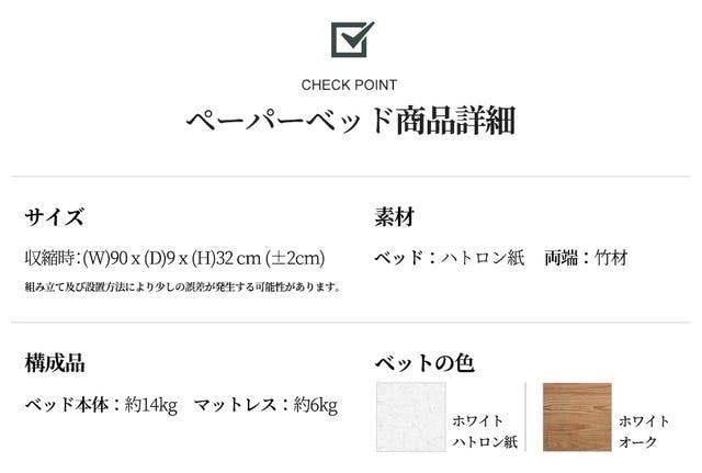 ※軽いペーパーベッドですが、それでもそれなりの重量がありますのでご年配の方や重たいものが苦手な方、小さいお子さんが使う時は苦労するかもしれません。そのような場合は2人以上で展開することをおすすめいたします。展開の難易度には個人差があります。予めご了承ください。