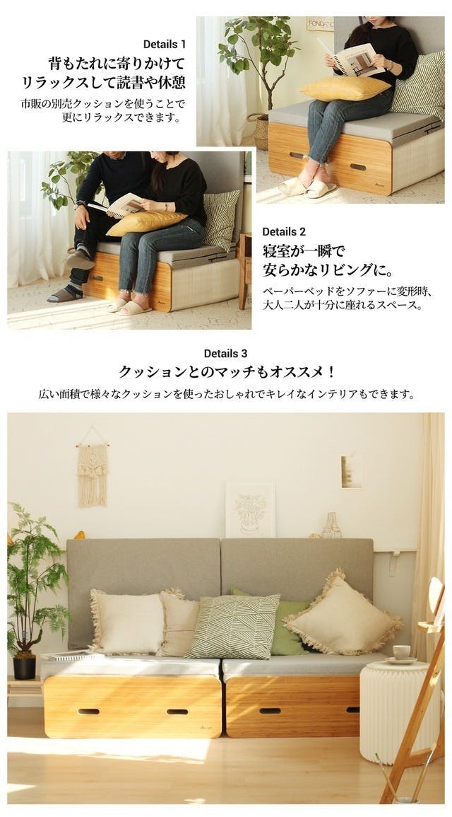 通常のベッドですと設置に数人がかりで引っ越しの時に1度するだけですが、ペーパーベッドなら簡単にお部屋の配置換えも可能になります。邪魔になった際には縮めてただの板になります。