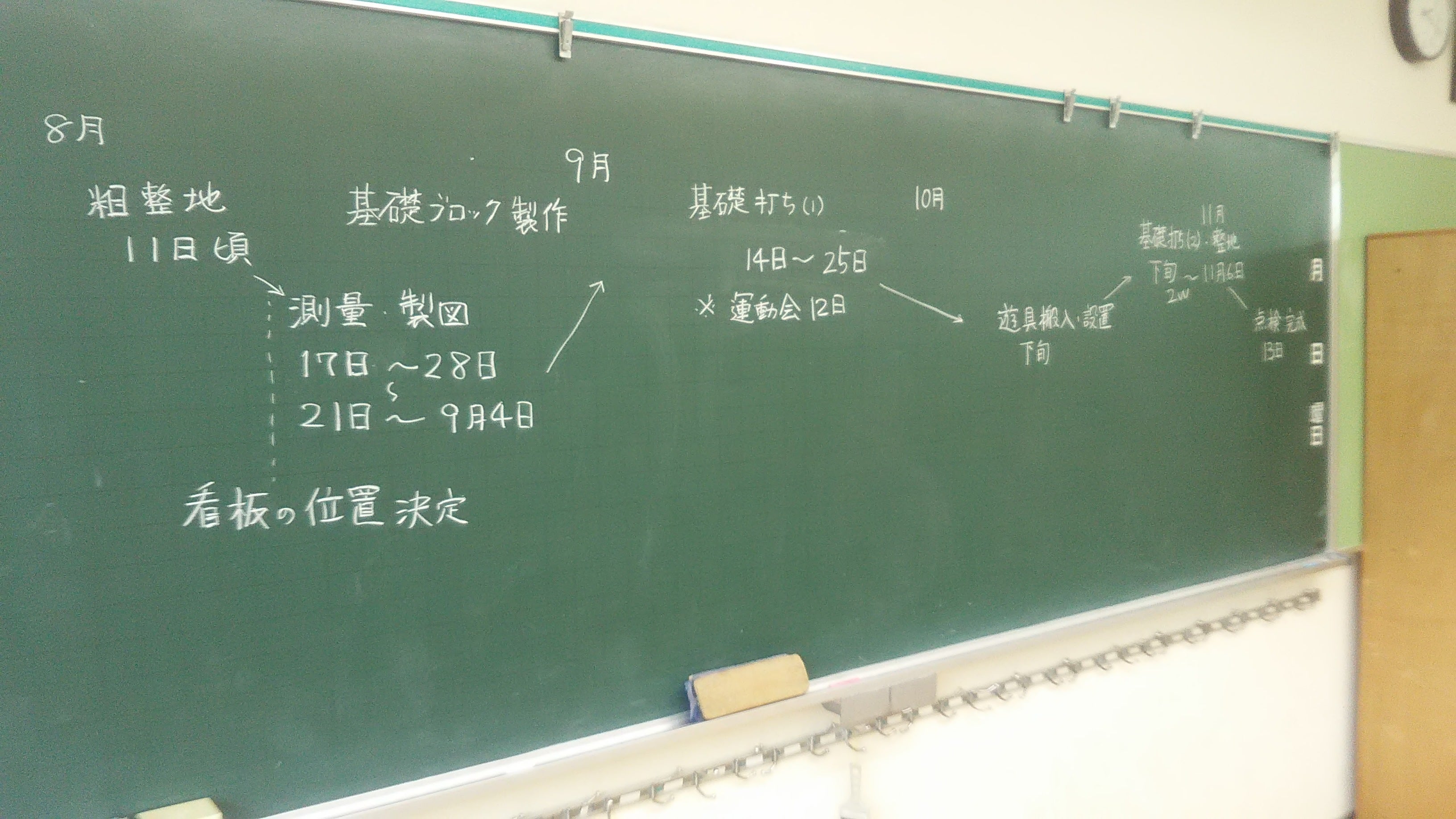 5月の旧滑り台撤去からだいぶ間が空いてしまいました。ご報告が遅れましたことをお詫び申し上げます。この間に、次のような会合が開かれました。5月15日 遊具工事業者による現場確認5月~6月 遊具工事業者による設計図制作7月16日 施設設備部会で資料確認、基礎工事業者の選定について協議7月30日 基礎工事業者説明会8月4日 見積合わせによる基礎工事業者決定8月7日 遊具工事業者と基礎工事業者による打ち合わせ会写真は、8月7日の打ち合わせを黒板にまとめたものです。予定では8月末を完成予定としていましたが、遊具の輸入部品が新型コロナウィルスの影響で大幅に遅れており、11月中旬の完成予定となっています。