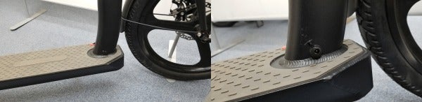 通常のキックスケーターだと足の置き場が幅10㎝位長さ25㎝位の物が多いですが、H100は横幅約14㎝、縦幅約50㎝と、大人が立っても問題ない幅がありますので、踏み外し等のリスクを極力少なくし、安心して走行出来ます。