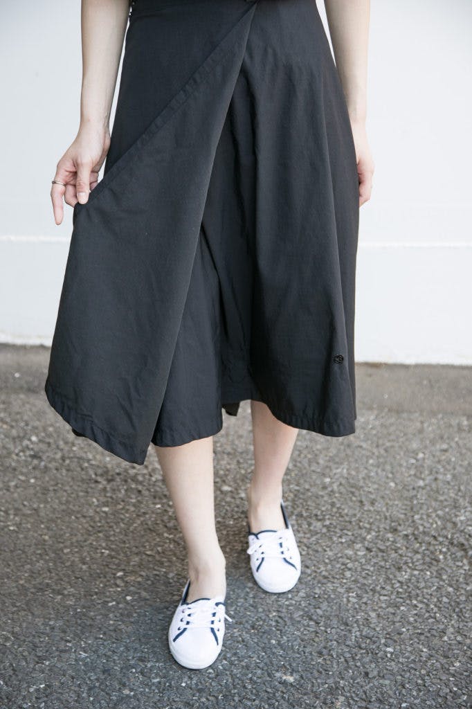 3)裾についた前のマグネットと、後ろのマグネットを手で合わせると、前後が留まります。マグネットがついていない布が前に重なります。前に重なる布も、ペラペラしないように、左足側の裾のスナップボタンを留めます。右足側の裾のスナップボタンも留めるとさらにめくれにくいです。