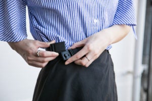 2)くるっとベルトを前から後ろに回して、右側の腰の位置でバックルを留めます。