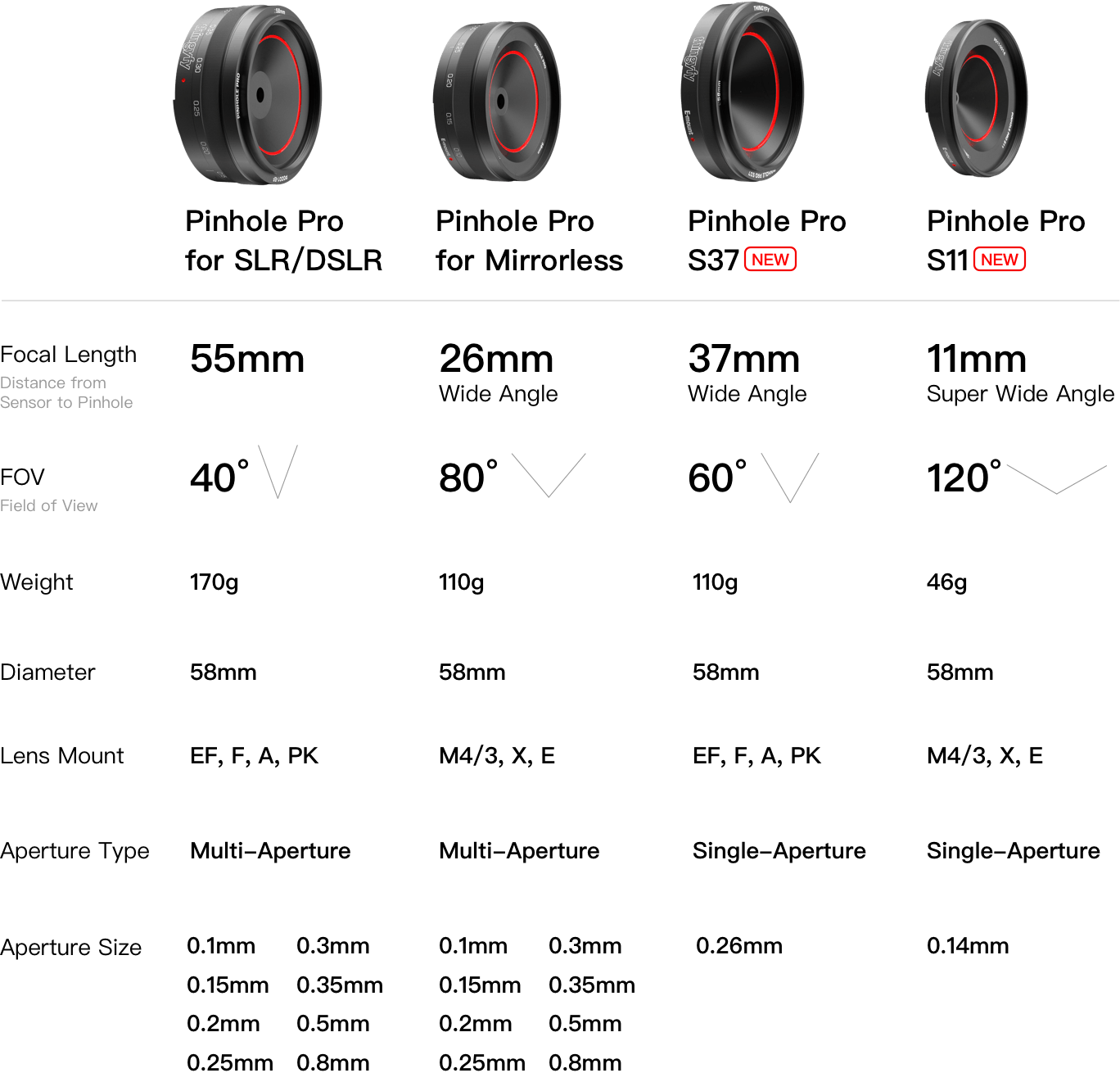※ Pinhole Pro for SLR/DSLR以外はすべて広角レンズとなります。