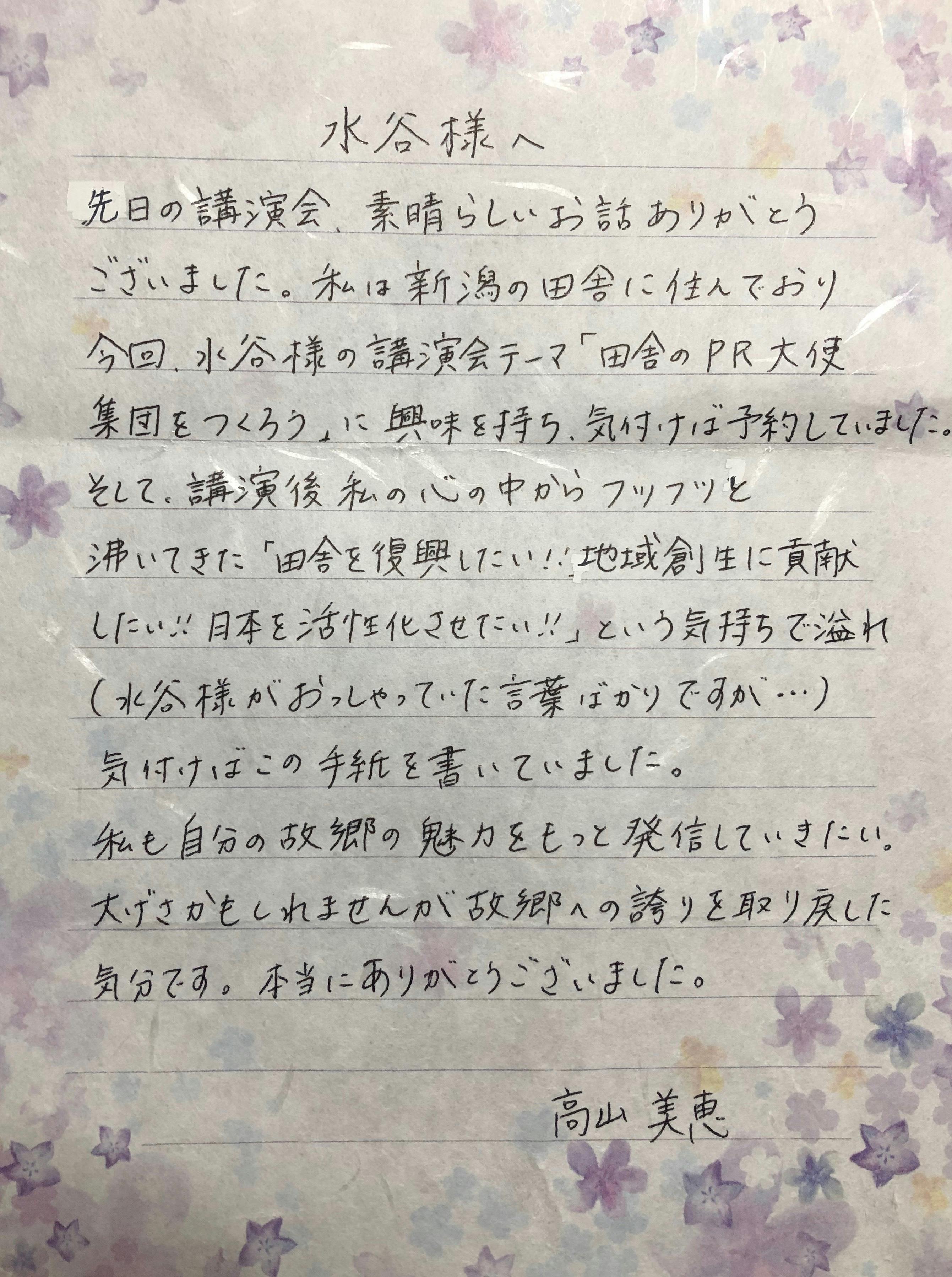 プライバシー保護の確認をさせていただき、2名様のお手紙を載せさせていただきます。