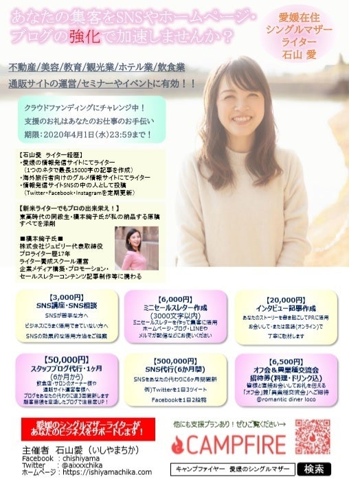 ご覧いただきありがとうございます。石山愛(ちか)です。【リターン追加しました】〈追加リターン①〉【お試し】ミニセールスレター作成(3000字以内) 6000円 10名様まで〈追加リターン②〉スタッフブログ代行 50,000円(1ヶ月分) 1法人様限定※6か月以上のご利用をお願いします。〈追加リターン③〉【在宅のお仕事】ライターのノウハウ伝授とお仕事委託 500円 10名様限定〈追加リターン④〉SNS講座・SNS相談 3000円 5名様限定〈追加リターン⑤〉「みさちか♡」愛媛県・中予地方ならどこでもご訪問&演奏 4000円〈追加リターン⑥〉クラファン後のオフ会&異業種交流会招待券(当日の料理・フリードリンク込)6500円ぜひ見ていってくださいね!!さて、クラウドファンディング終了まであと16日!支援していただいている11名の皆様、本当にありがとうございます!まだまだ広めていきたいので、チラシを作りました。イラストレーターとかフォトショップ持ってないのにできたんですよ。なんとPowerpointです!パワポ!フリーテンプレートを加工したものではありますが、なかなか良い出来栄えではないでしょうか^^チラシを置かせていただいた、記念すべき初の場所は、大街道のロコさん!!私の営業らしい活動、第一号!ついでにほっぺた落ちまくりのリゾットいただいて大満足^^♡ちなみにロコは、今回のクラウドファンディング・オフ会の会場です!オフ会参加券のリターンもぜひチェックしてみてくださいね。あと3カ所くらい、置かせてもらえるよう今から交渉です。ちょっと少なすぎ・・・w松山市内あたりで置かせてもらえるところがあれば、ぜひぜひ教えてくださいませ!★Facebookのメッセンジャー→「m.me/chishiyama」とインターネットで検索★LINE公式→https://lin.ee/onkxBnk力作のチラシ処女作(笑)をたくさんの方にぜひ見てほしい!ウチに置いてもいいよーという方いませんか???ぜひご紹介・ご協力をよろしくお願いいたします!