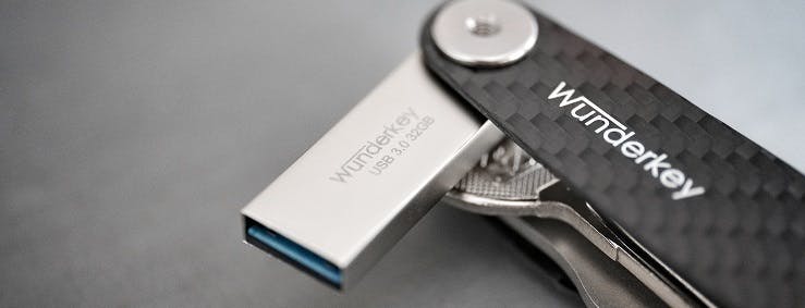 WunderkeyはUSBメモリ専用ケースとしても使用できます。1個のUSBメモリは厚みがあるので、鍵2枚分として考えます。WunderkeyにUSBメモリ2個を収納できます。Wunderkeyに付属する延長ノズルを使用すると合計4個、エクステンションセットを追加すれば合計6個のUSBメモリを収納できます。写真は付属の延長ノズルと2つのエクステンションセットを使用し8個のUSBメモリを収納しています。
