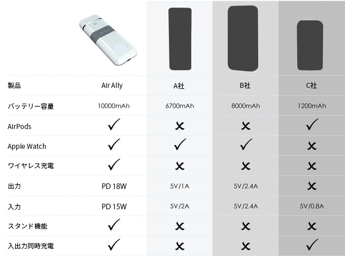 4種類のAppleのデバイスがすべて同時充電できる大容量モバイルバッテリーなので、コンセントのない場所でバッテリー切れの心配がなくなります。コンパクトなデザインのこのAirAllyを選ぶことで、手軽に出張や旅行で出かけることも出来ますので、とても便利でミニマルなライフを楽しめます。