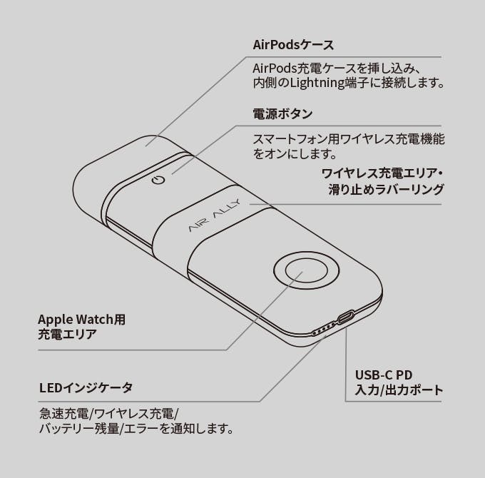 AirAlly(エアーアリー)は、iPhone、iPad、Apple Watch、Air podsなどのApple製品を最大4台同時に充電できる10000mAh大容量モバイルバッテリーです。