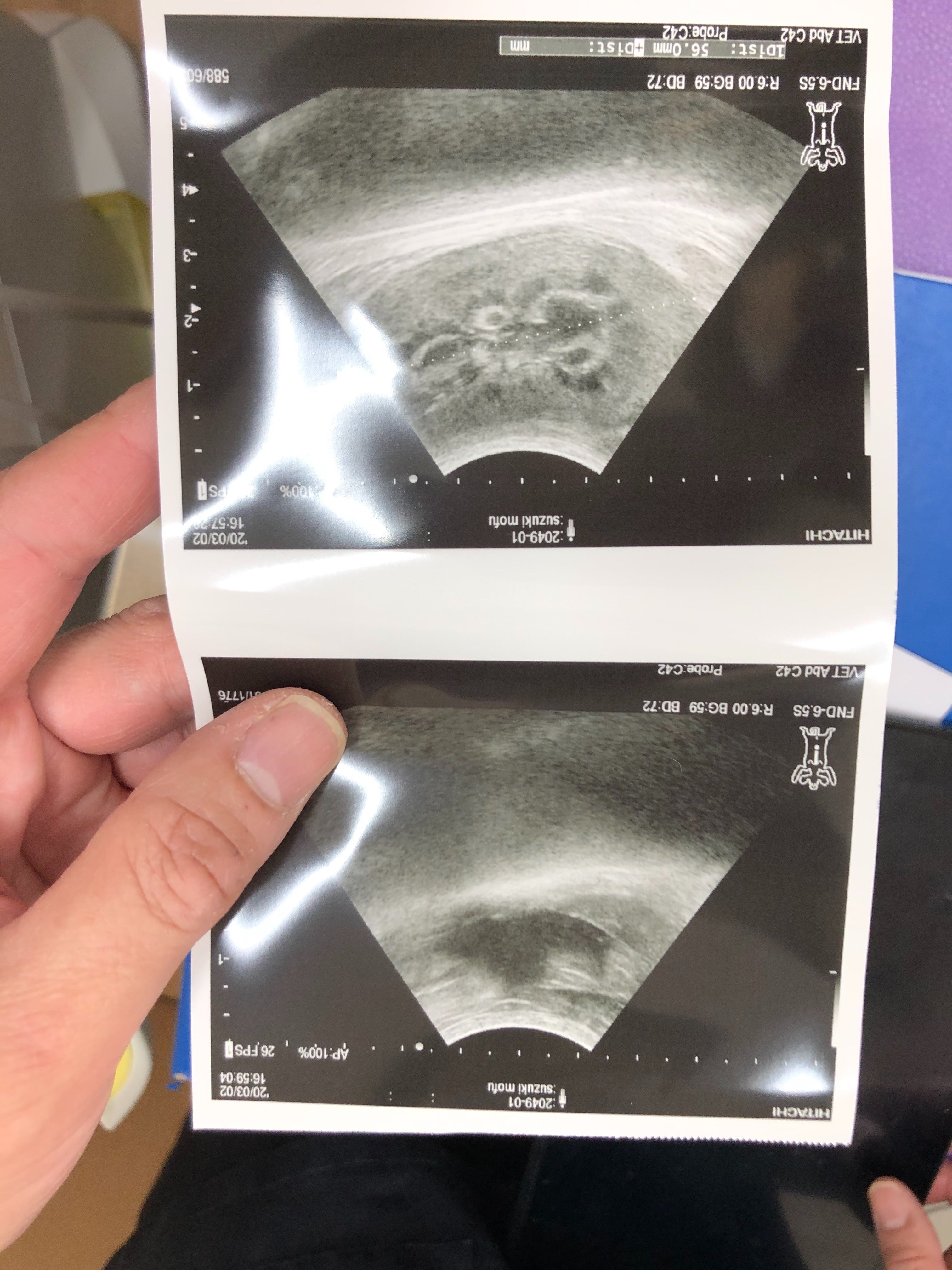 ↑(エコー上部:腎臓にFIPの特徴である白い影、エコー下部:少量の腹水あり)