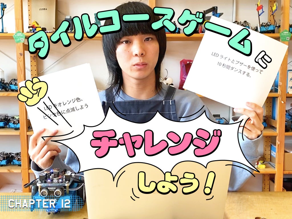 mBotを自動運転させて、タイルで作ったコースをゴールまで動かすゲームをやってみよう。