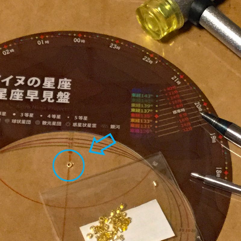 今までに作った星座早見盤は“割ピン”を使っていましたが、今回は透明シートを1枚挟むので、ハトメorカシメで留める必要があります。