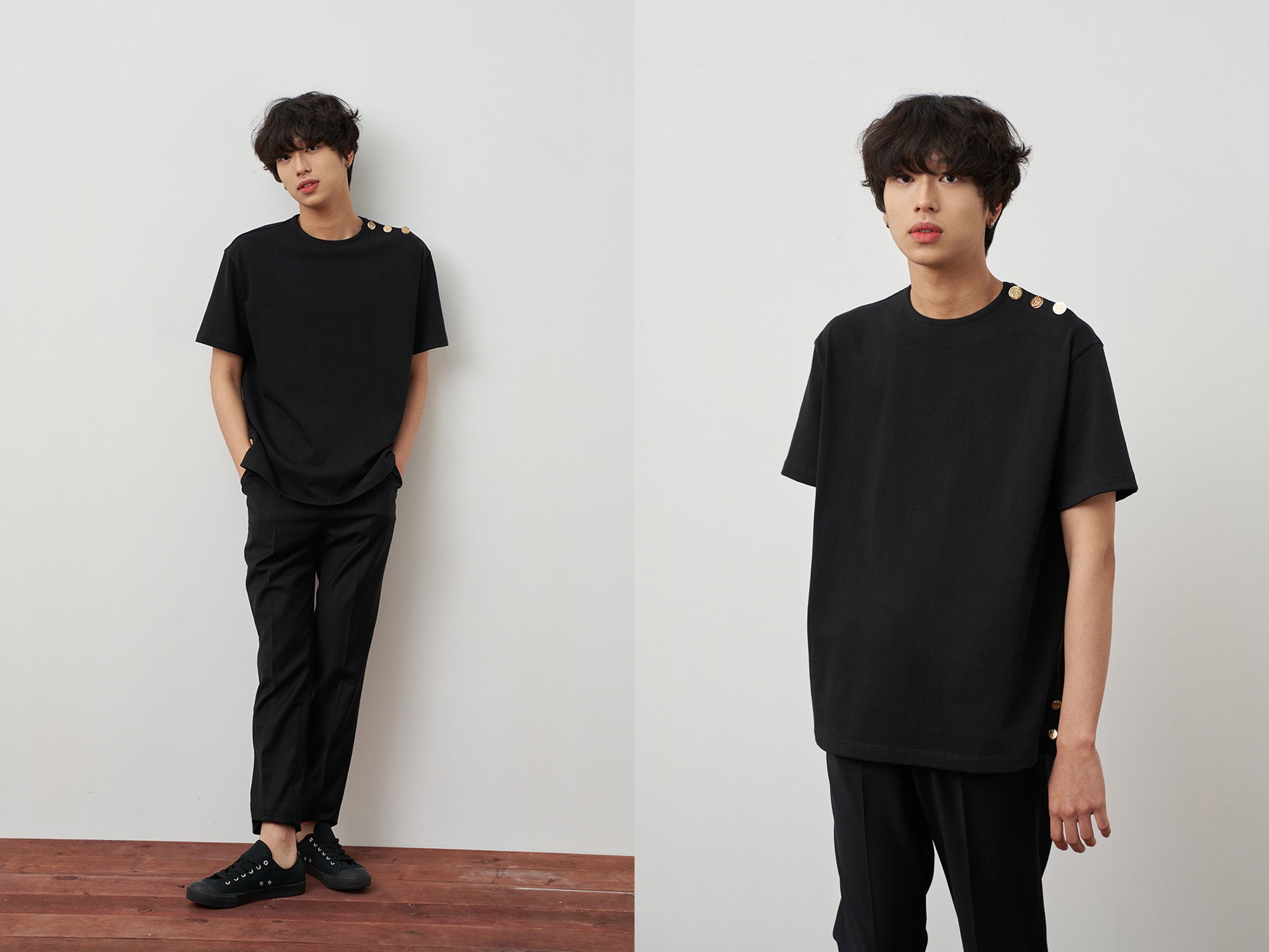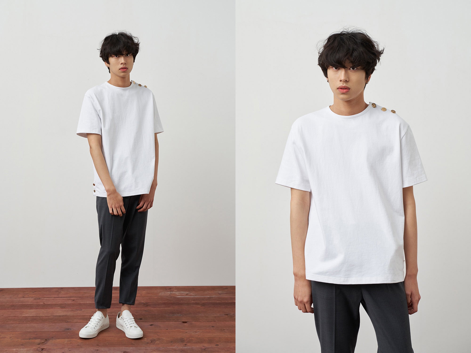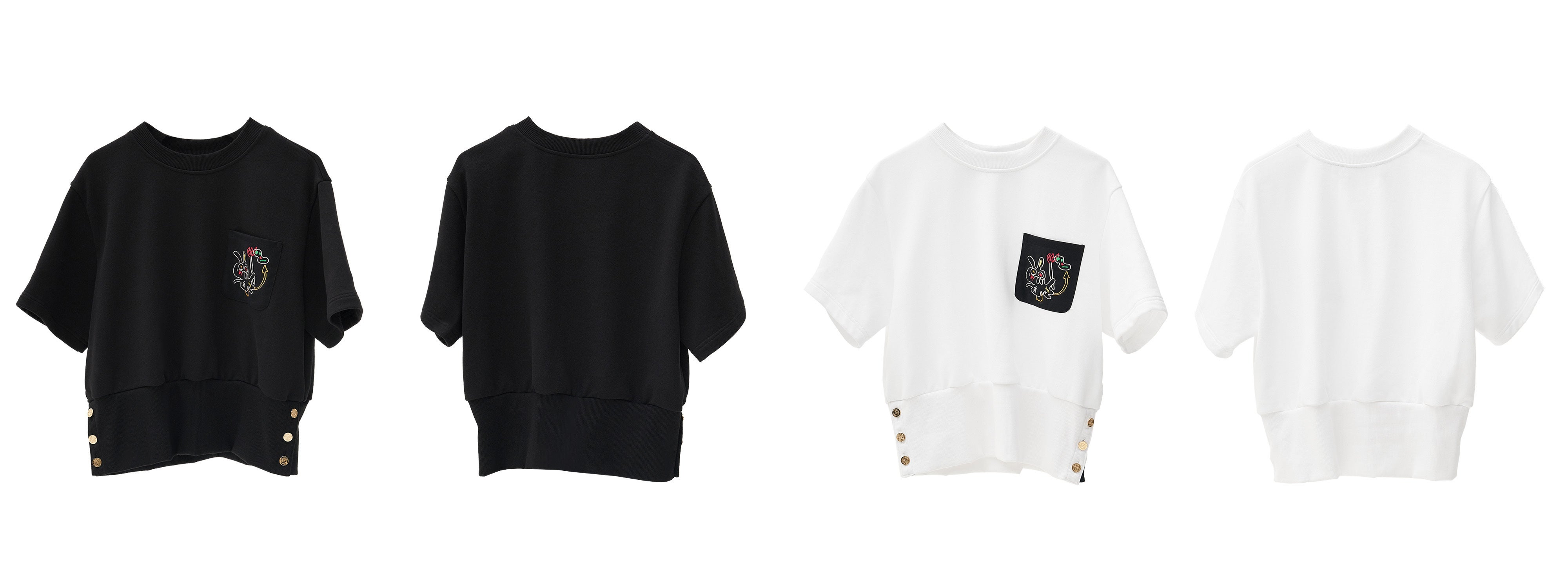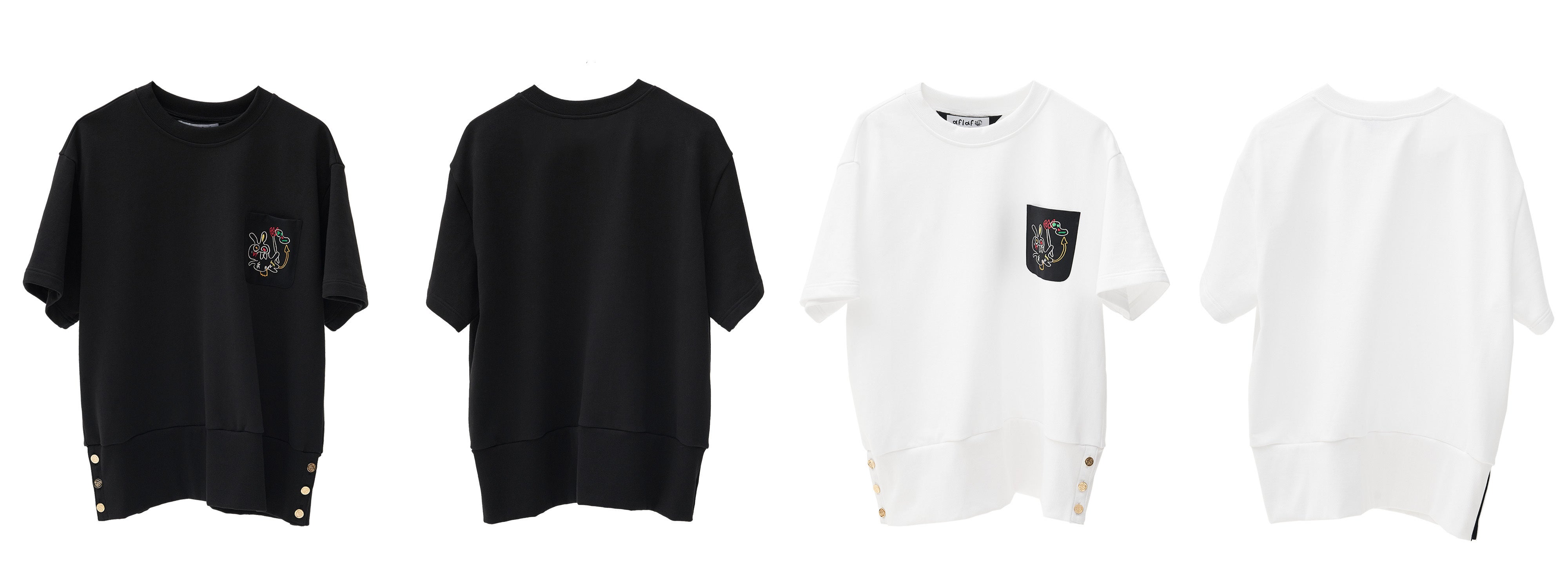 ▶ 綿100%のTシャツの左肩には黄金のシグネチャーボタンでユニークさを加えました。服を着替える時に非常に便利で、ボタンを開けたままて着るとまた違ったスタイルでコーディネートできます。