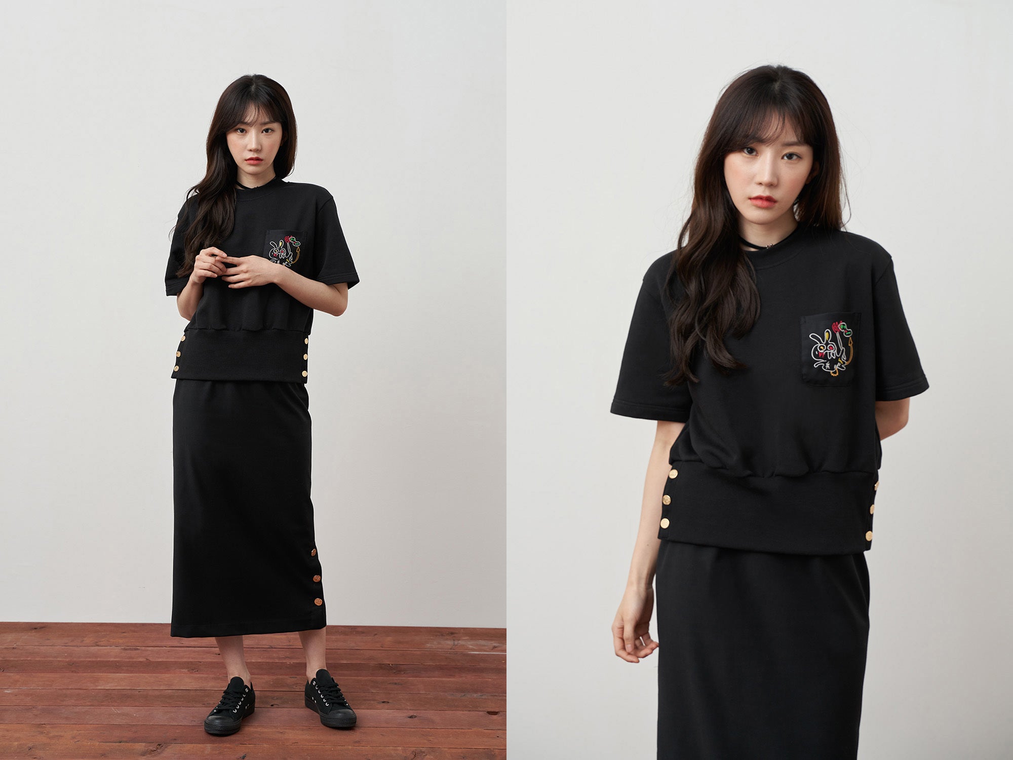 デビル・ラビット刺繍がポケットに刻んであり、腰部分には黒ゴムバンドに金色のシグネチャーボタンが飾られてポイントになります。一見シンプルに見えるデザインに腰ラインを入れ日常生活でエッジの効いたスタイリングが可能になります。
