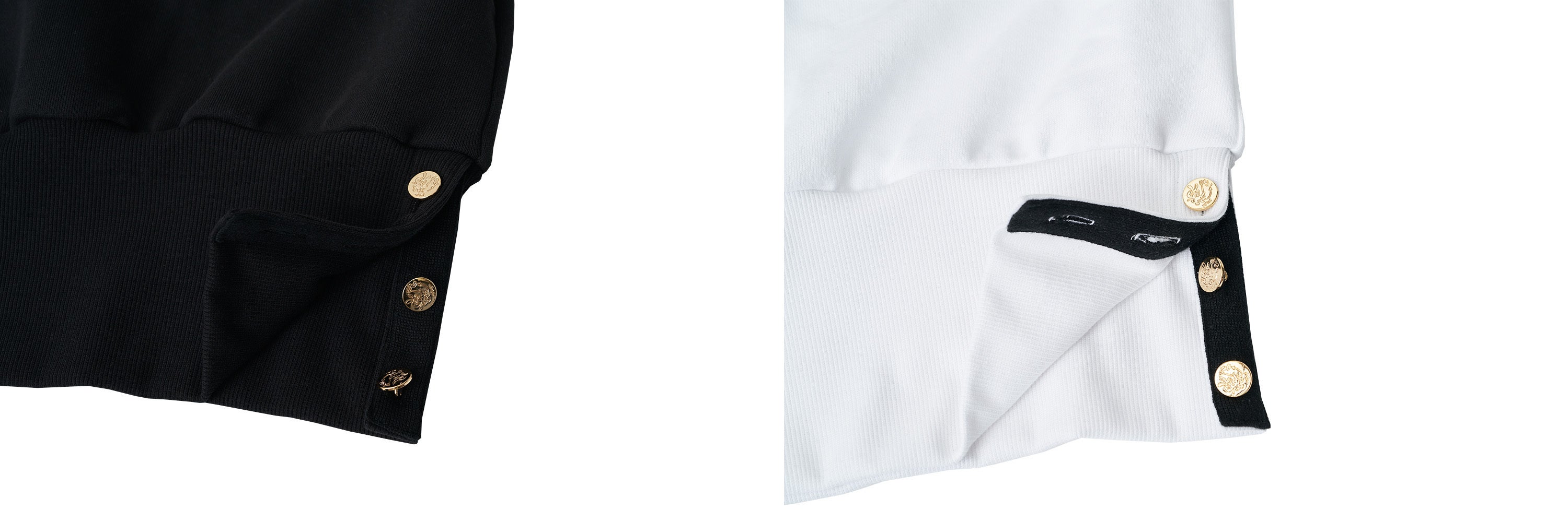 ▶ 綿100%のスウェットシャツの下に金色のシグネチャーボタンで仕上げています。腰のラインにある黒いゴムバンドは、簡潔ながらも高級感を加えて、多種多様なコーディネートができるようにしてくれます。
