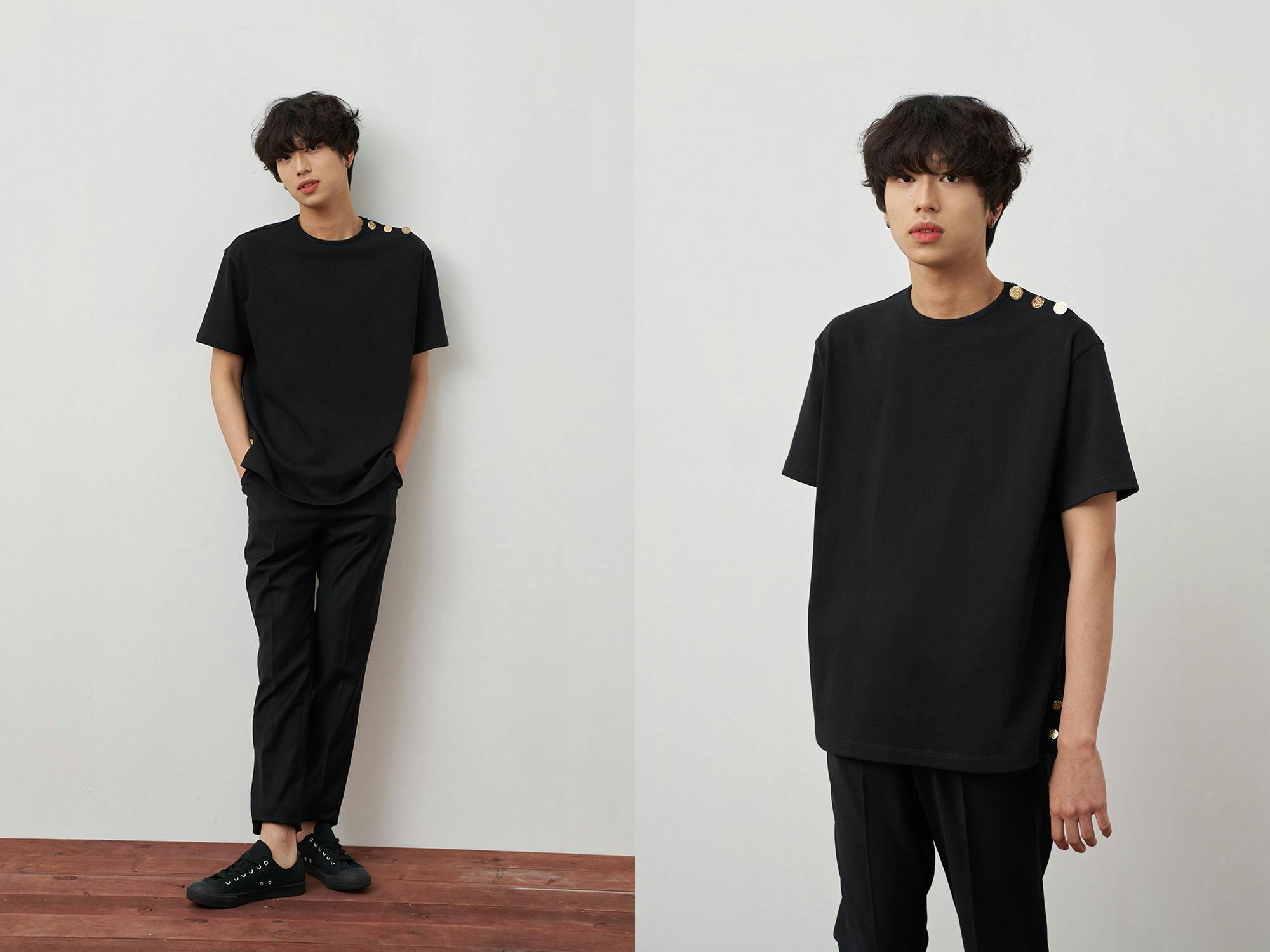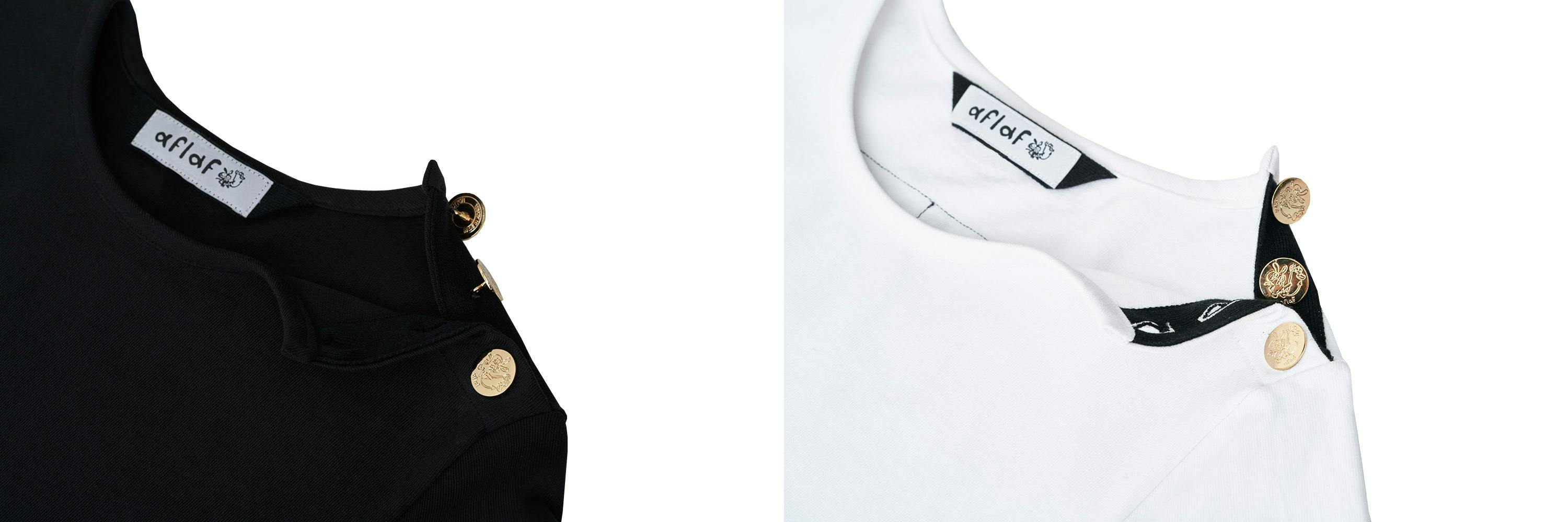 ▶ 綿100%のTシャツの左肩には黄金のシグネチャーボタンでユニークさを加えました。服を着替える時に非常に便利で、ボタンを開けたままて着るとまた違ったスタイルでコーディネートできます。